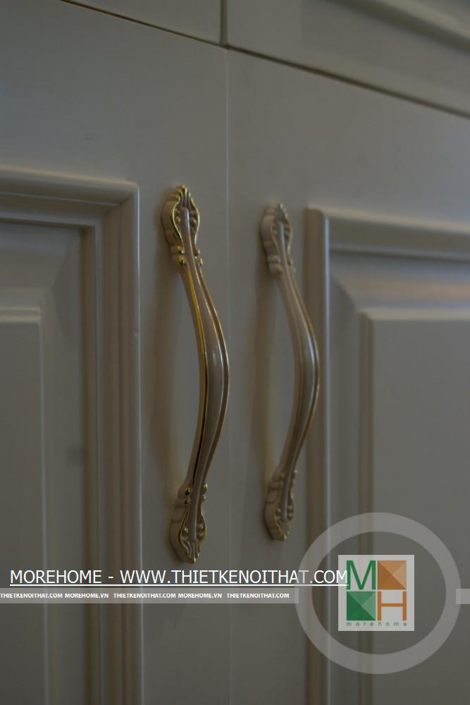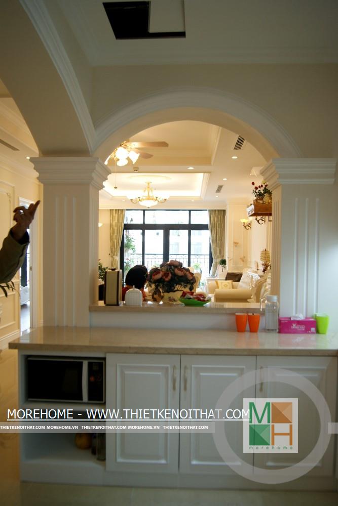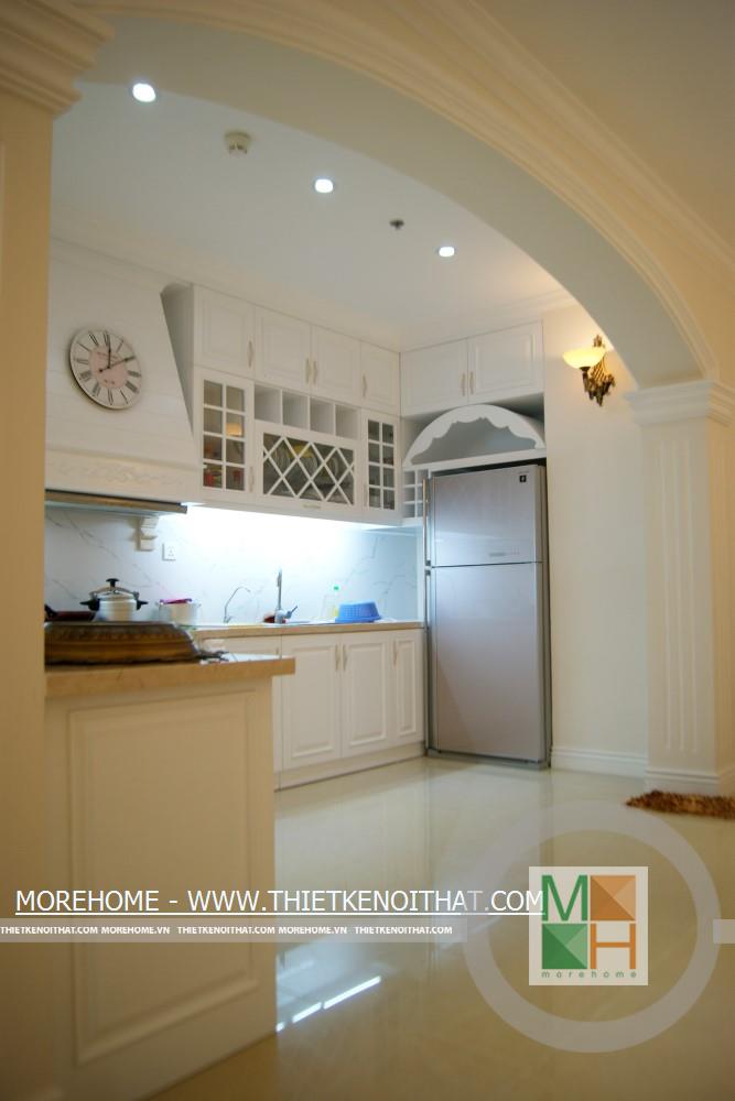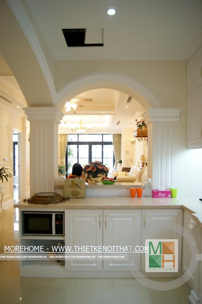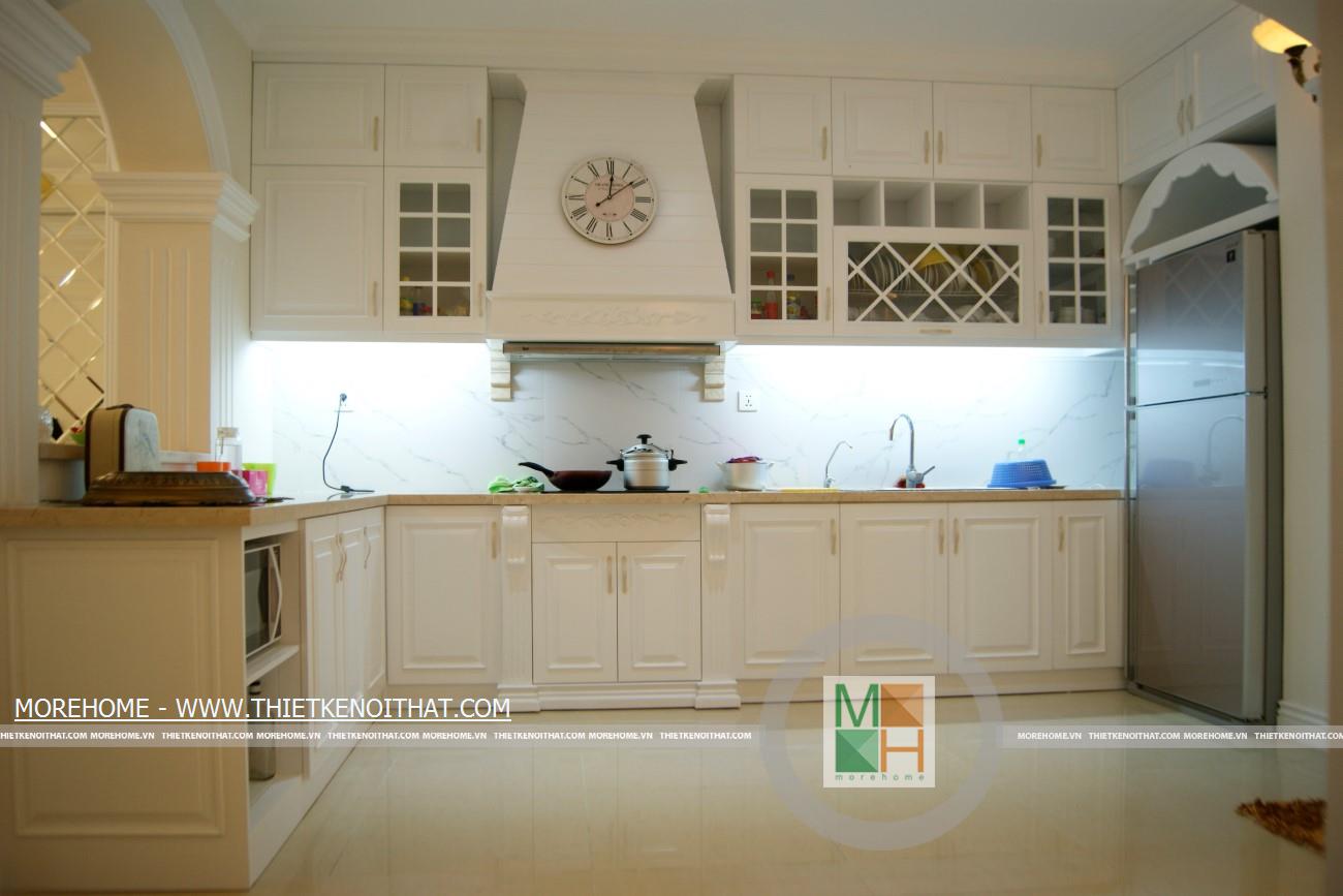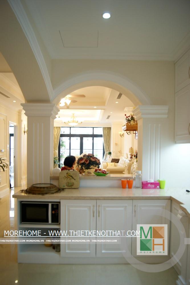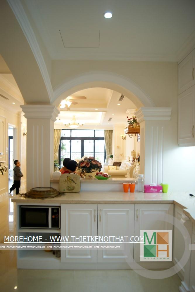Thiết kế nội thất phòng bếp tân cổ điển vô cùng tiện dụng. Cách bài trí những phụ kiện nhà bếp, một cách khoa học tạo thành một dây chuyền khép kín xung quanh khu bếp. Nội thất bếp với sự kết hợp tinh tế giữa tủ bếp, dụng cụ nhà bếp và cách sắp xếp có tính thẩm mỹ cao mang đến sự hoàn hảo cho căn bếp nhà anh Phú.
