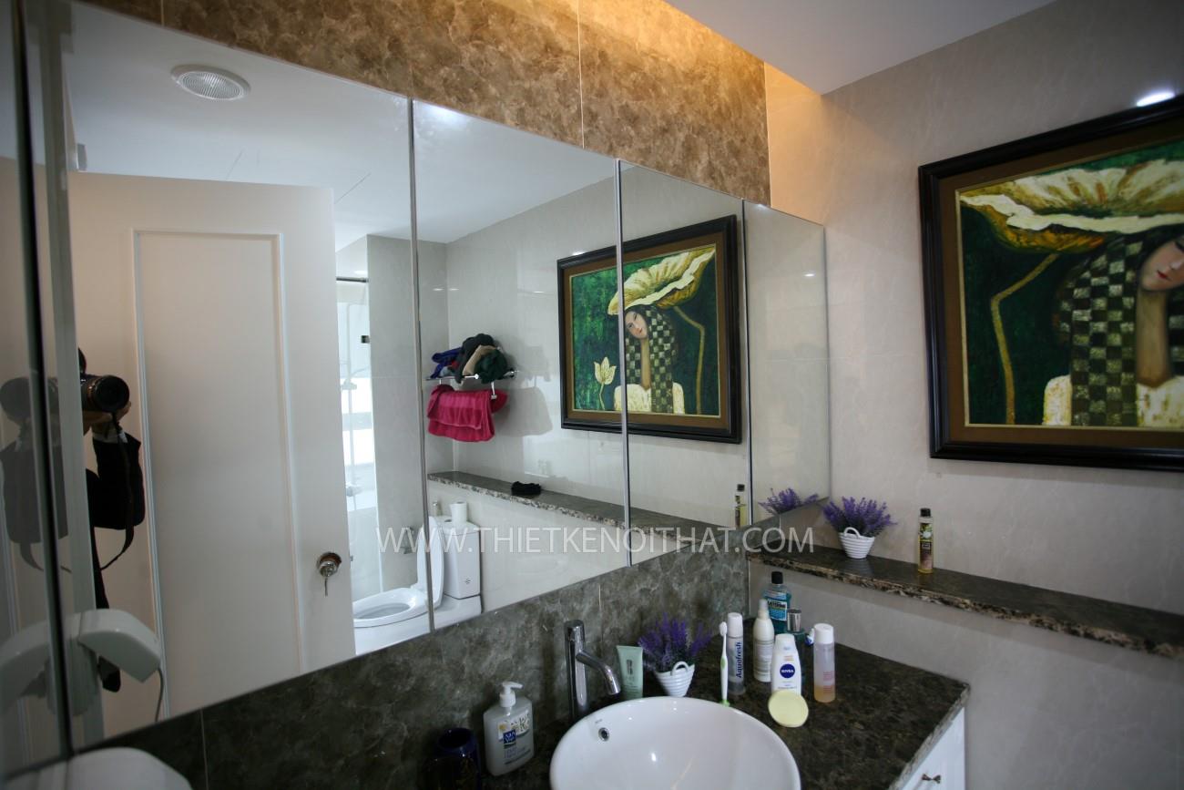 Nhà vệ sinh cũng được thiết kế một cách không kém ấn tượng, không gian này sẽ là nới thư giãn tuyệt vời nhất cho gia đình chị Lan. Mọi thứ kết hợp hoàn hảo tạo nên một không gian tổng thể tuyệt vời nhờ việc lựa chọn thiết kế nội thất chung cư trường phái Tân cổ điển. Nếu bạn là người yêu thích trường phái thiết kế nội thất này hãy liên hệ ngay với Morehome theo số điện thoại 0975438686.