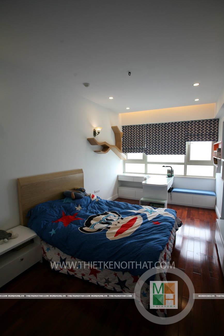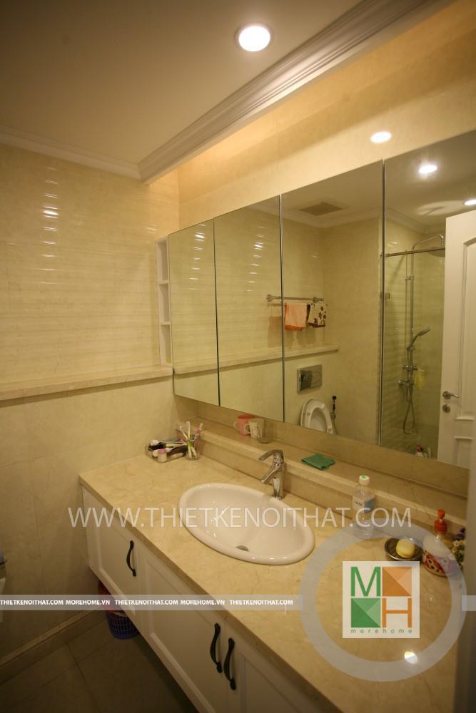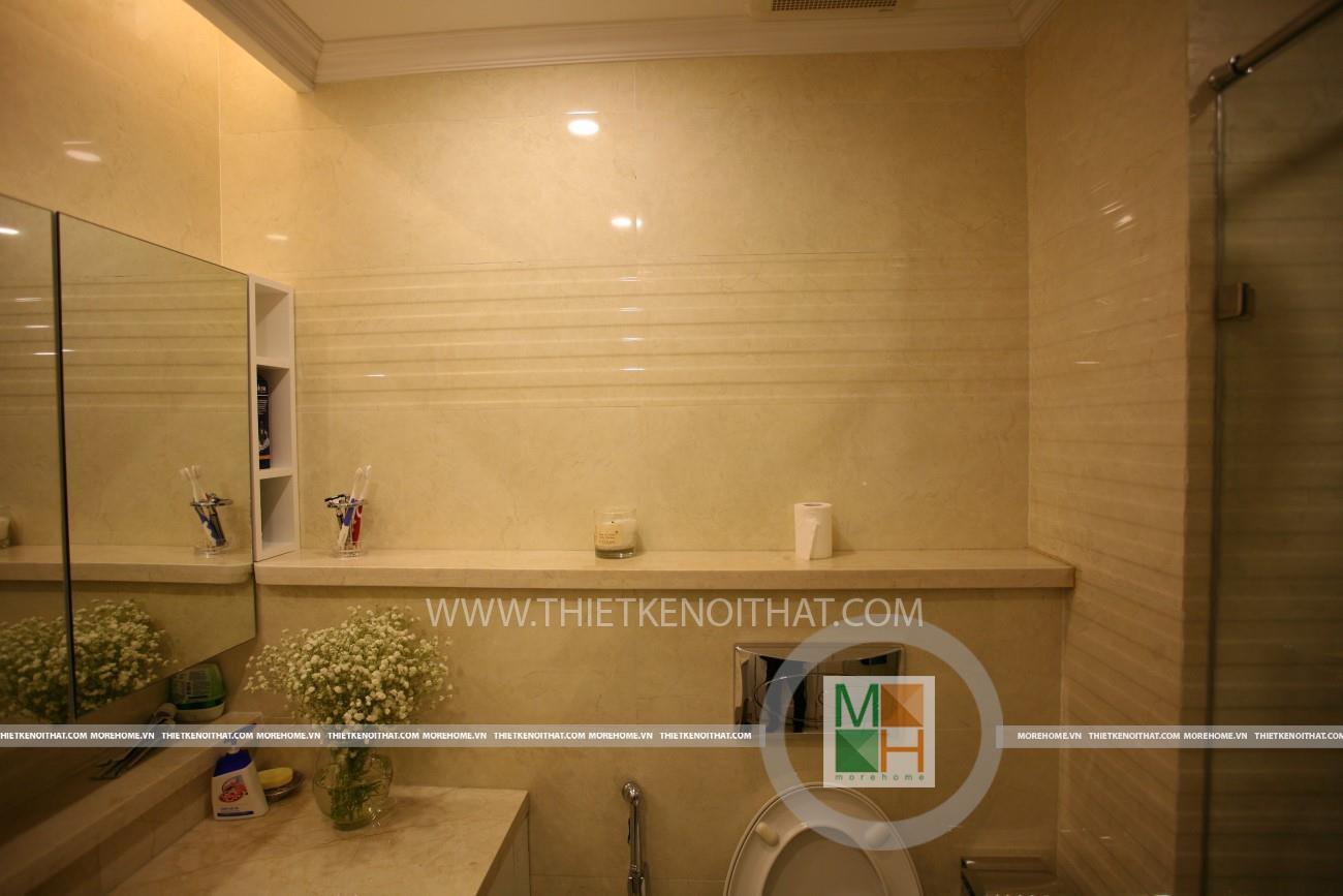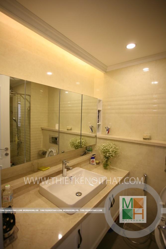 Không chỉ dừng lại ở phòng bếp, phòng vệ sinh cũng được chú trọng trong từng đường nét thiết kế. Các kiến trúc sư của Morehome đã tận dụng một cách sáng tạo những chi tiết nhỏ từ chậu rửa, kệ rửa, gương một cách tinh tế nhất để tạo nên một không gian sang trọng cho toàn bộ căn hộ.