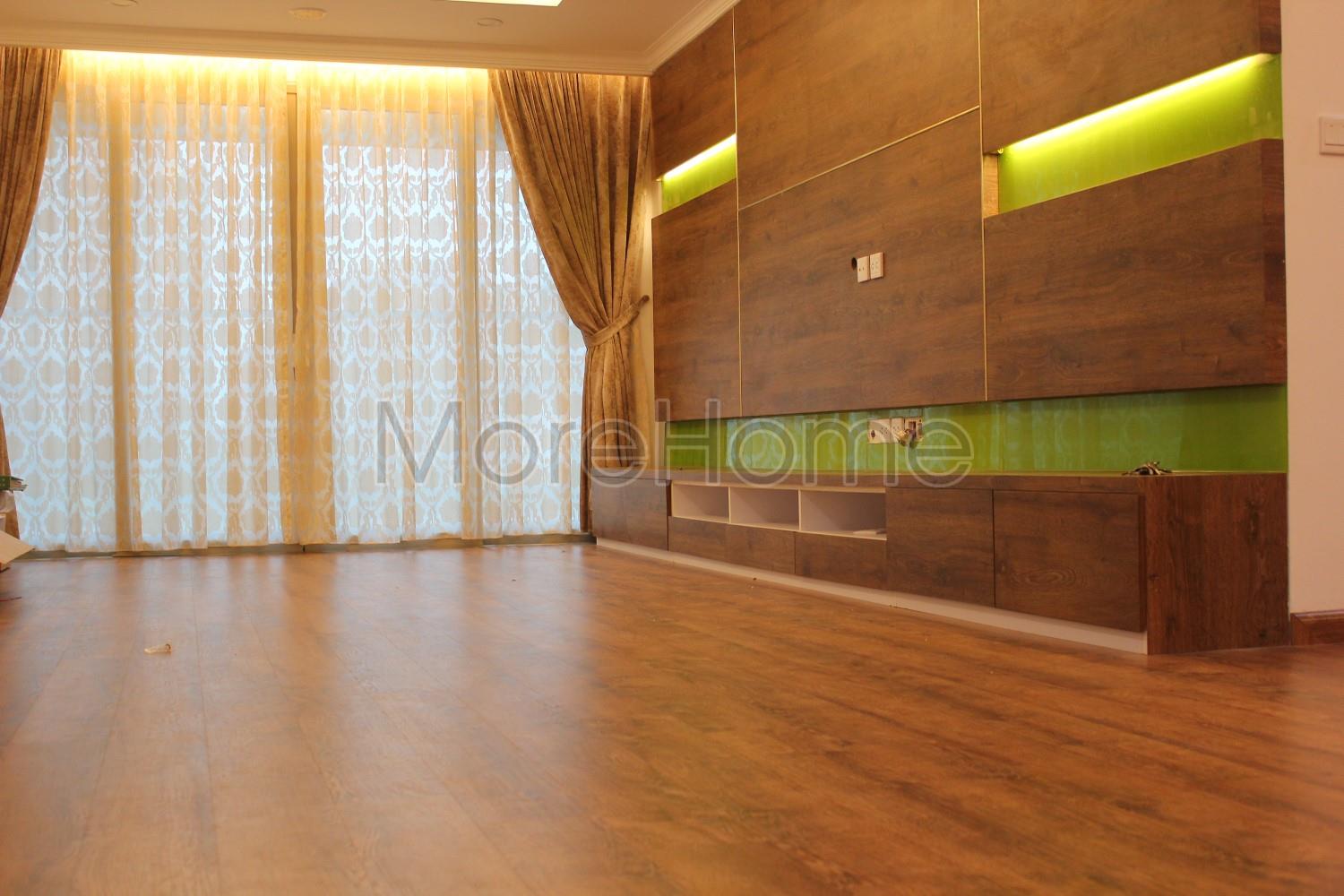 Không gian được thiết kế vô cùng ấn tượng với màu sắc đặc trưng của sàn gỗ màu nâu trầm tự nhiên. Nhìn qua không gian này bạn có thể thấy được sang trọng từ vân gỗ. Sự kết hợp màu sắc rất ấn tượng cũng cửa sổ lớn với rèm cửa mang đến một căn hộ vô cùng hoàn hảo.