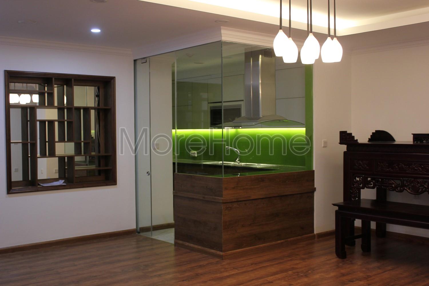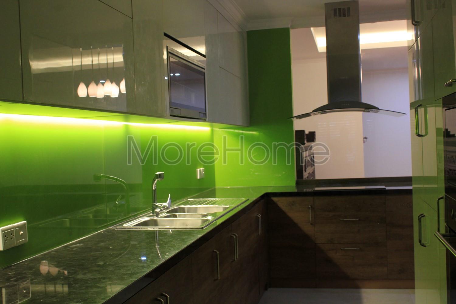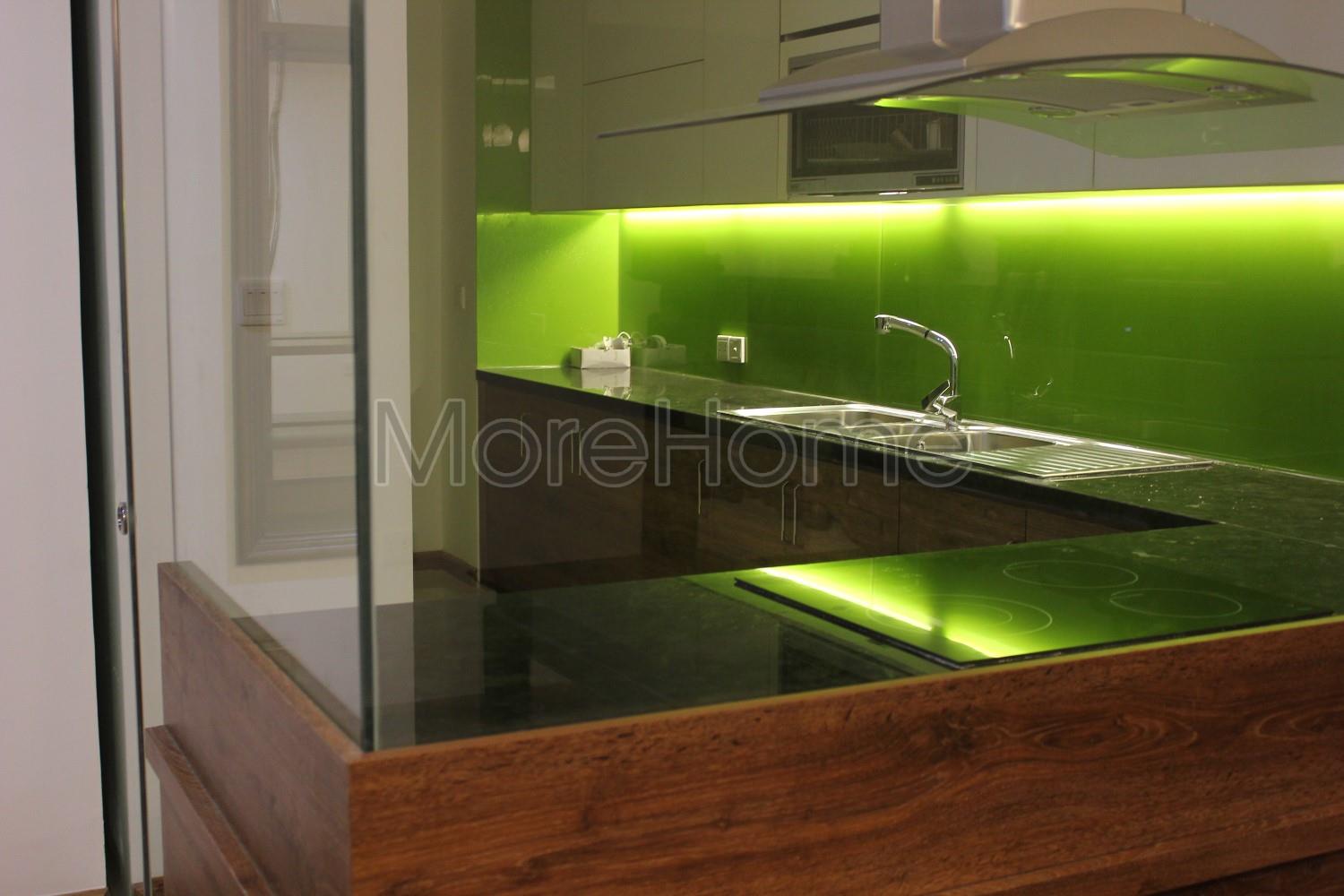 Thiết kế nội thất phòng bếp cũng tương đối tiện nghi, lựa chọn kính ốp bếp màu xanh lá kết hợp với hệ thống đèn chiếu sáng mang đến một căn bếp màu sắc sinh động. Hơn thế nữa các phụ kiện nhà bếp được bố trí khoa học cùng với chiếc tủ bếp màu trắng tinh tế giúp cho gia chủ có một căn bếp thật tiện nghi.