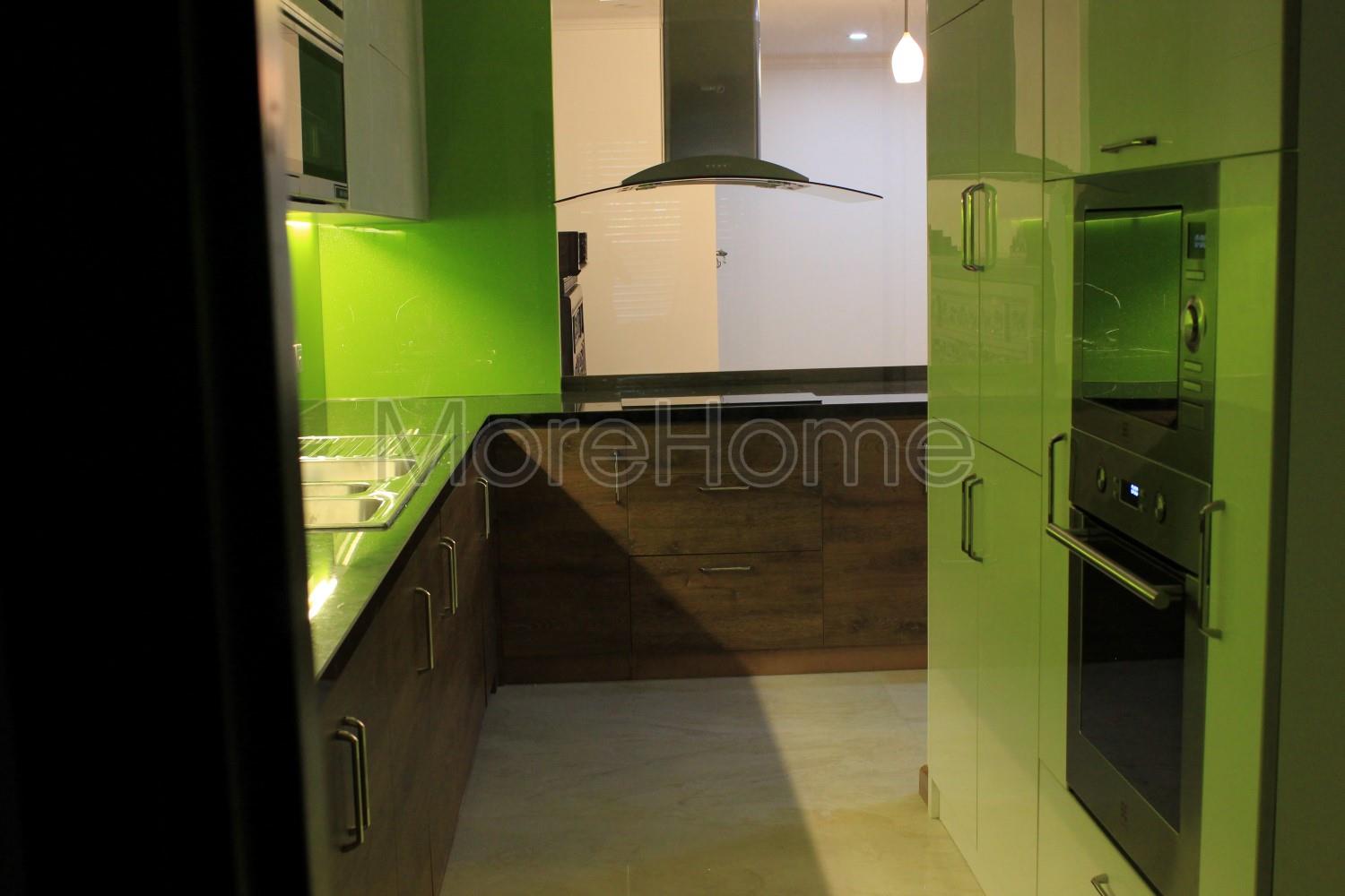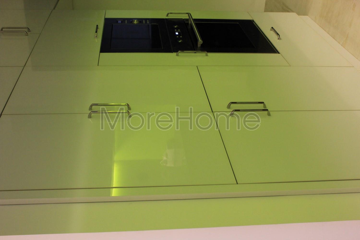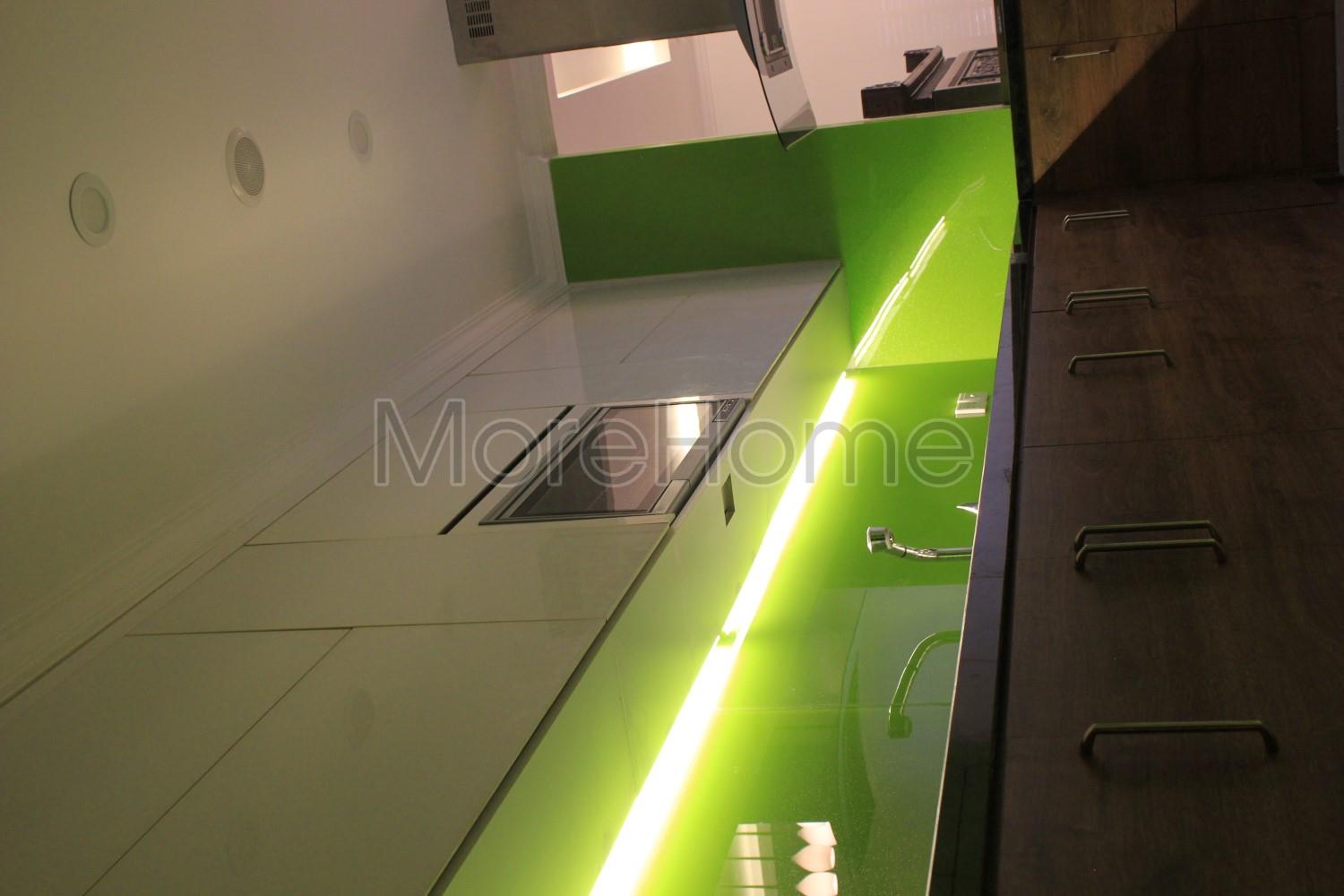 Thiết kế nội thất phòng bếp cũng tương đối tiện nghi, lựa chọn kính ốp bếp màu xanh lá kết hợp với hệ thống đèn chiếu sáng mang đến một căn bếp màu sắc sinh động. Hơn thế nữa các phụ kiện nhà bếp được bố trí khoa học cùng với chiếc tủ bếp màu trắng tinh tế giúp cho gia chủ có một căn bếp thật tiện nghi.