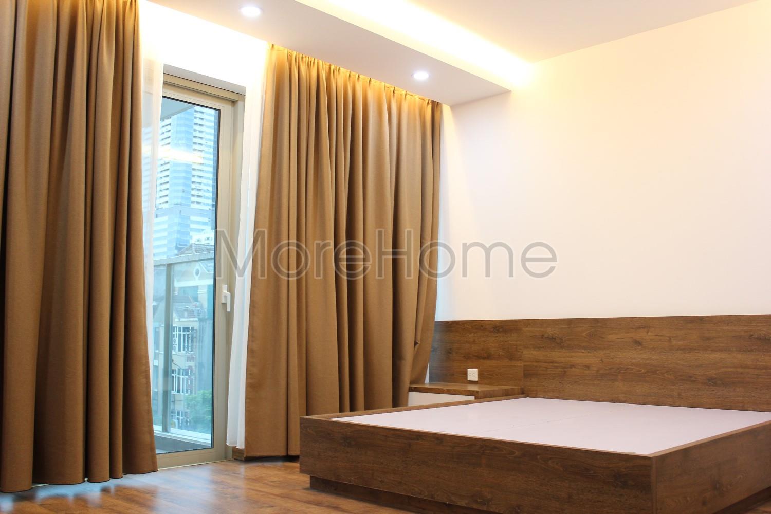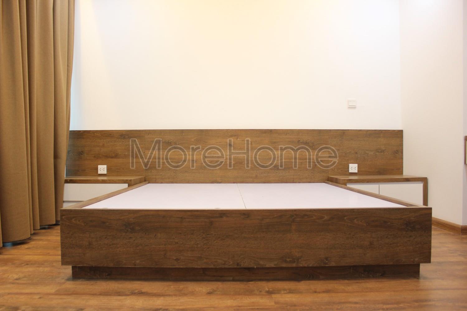 Thiết kế nội thất phòng ngủ được chú trọng không kém, không gian này với màu gỗ là màu sắc chủ đạo, chiếc giường ngủ làm từ nội thất gỗ óc chó sang trọng và hiện đại giúp phòng ngủ trở nên bắt mắt và ấm cúng hơn. Không những thế căn phòng này còn được thiết kế một khung cửa lớn giúp ánh sáng ngoài tự nhiên có thể chiếu rọi vào phòng, cho không gian thêm phần thoáng đãng.