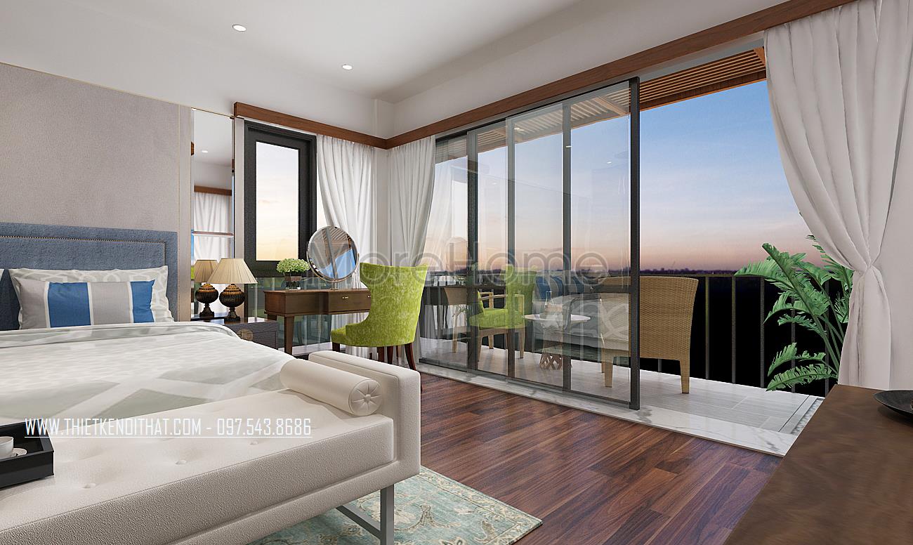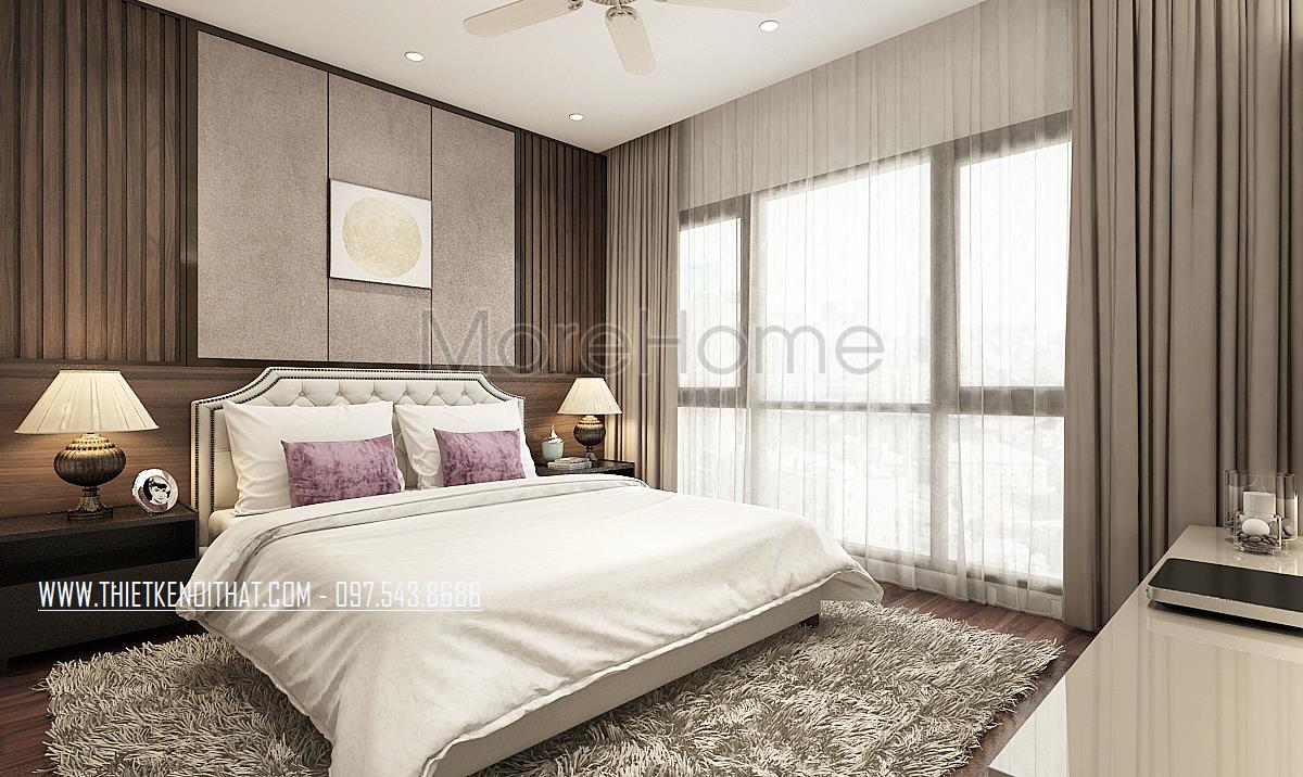 Tiếp theo là thiết kế nội thất không gian phòng ngủ. Nội thất phòng ngủ lấy điểm nhấn màu sắc là tone màu nâu ấm áp. Đây là một trong những tone màu mang lại hiệu ứng cảm xúc tích cực cho gia chủ, gợi mở một không gian vô cùng gần gũi và yên bình. Thiết kế tủ gỗ gần như âm tường là một trong những điểm đặc biệt giúp không gian trở nên mở và thoáng hơn rất nhiều. Bên cạnh đó, thiết kế kết hợp kệ và ngăn chứa đồ là một ý tưởng không tồi mang đến sự tiện nghi cho gia chủ.
