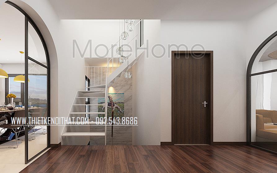 Thiết kế nội thất biệt thự Xuân Phương là sự kết hợp hài hòa của các thiết kế mang vẻ đẹp phá cách và hiện đại. Điển hình là cầu thang được sử dụng vật liệu mới lạ. Thay vì việc ứng dụng cấu trúc build-in cứng nhắc thì kiến trúc sư lại khéo léo sử dụng vật liệu nhẹ, tạo không gian mở và khoảng trống giữa các bậc thang góp phần lớn tăng độ thoáng và mở cho thiết kế.