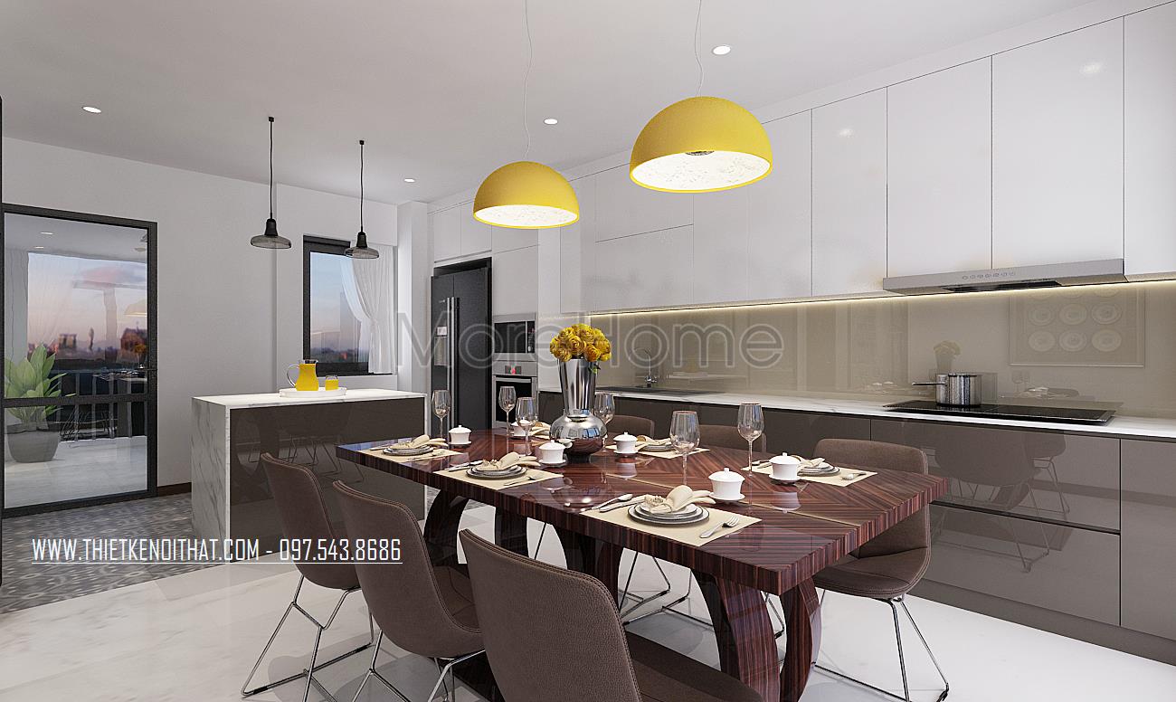 Cuối cùng là thiết kế nội thất bếp và bàn ăn hiện đại. Hai thiết kế này được sắp xếp liền kề mang lại cảm giác tiện nghi và mở rộng tầm quan sát, bao quát cho gia chủ. Thiết kế kệ và tủ bếp đơn giản, gần như tạo mặt phẳng ngang liền giúp tiết kiệm không gian. Thiết kế không hề nhấn mạnh đến các chi tiết trang trí cầu kỳ và tập trung hơn vào tính công năng và sự thuận tiện. Bàn ăn được thiết kế đơn giản, không gian đủ rộng cho các bữa cơm hay sinh hoạt ấm cũng của gia đình. Ngoài ra, các điểm nhấn màu sắc từ đèn trang trí hay các vân gỗ trên bàn ăn cũng góp phần tăng thêm sức cuốn hút cho không gian.