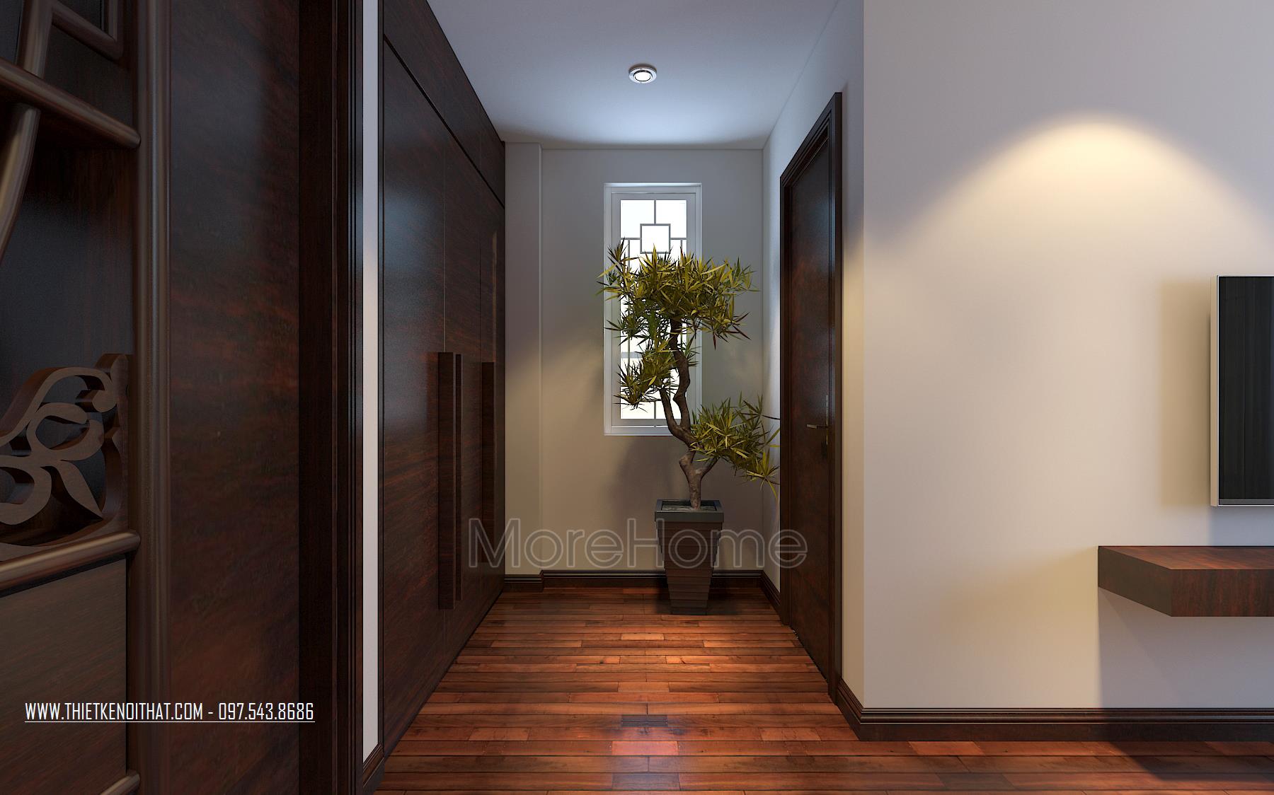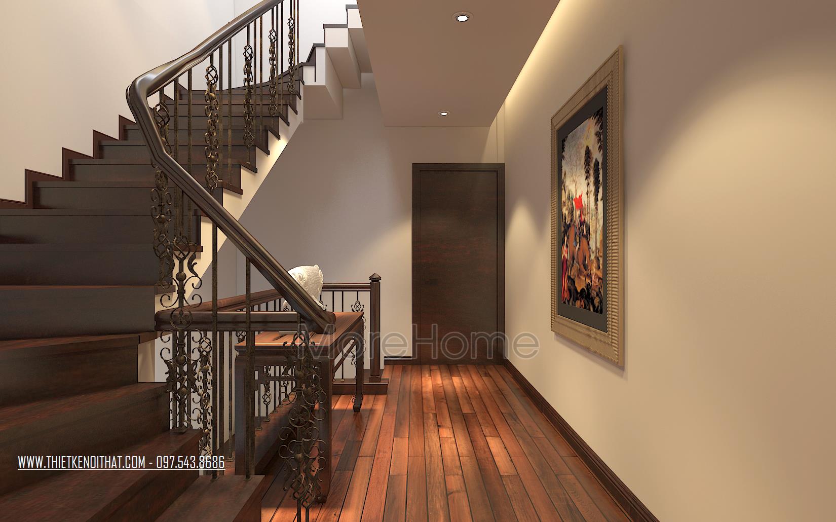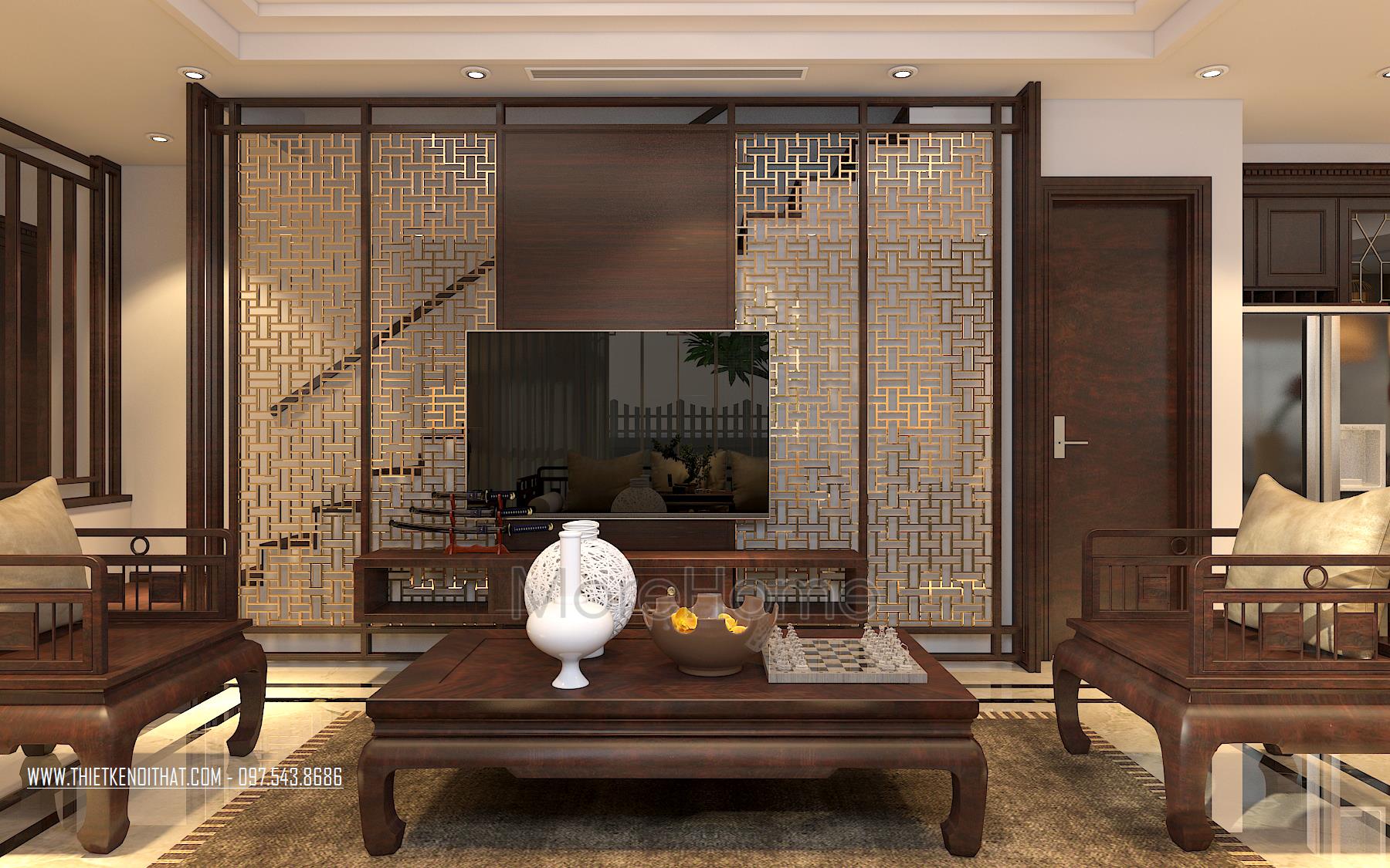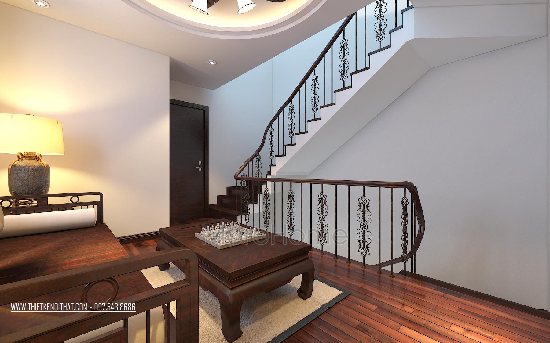Một điểm đặc biệt không thể không nhắc đến chính là thiết kế bức vách ngăn khéo léo tạo một mặt phẳng ấn tượng. Thiet ke noi that biet thu Vinhomes Thang Long này không những đảm bảo tính rõ ràng trong thiết kế, giúp phân chia không gian một cách hợp lý, bên cạnh đó còn góp phần lớn giúp tạo điểm nhấn về mặt thẩm mỹ. Cách tạo hoa văn không quá cầu kỳ nhưng vô cùng hút mắt, để lại ấn tượng tốt cho cả không gian.