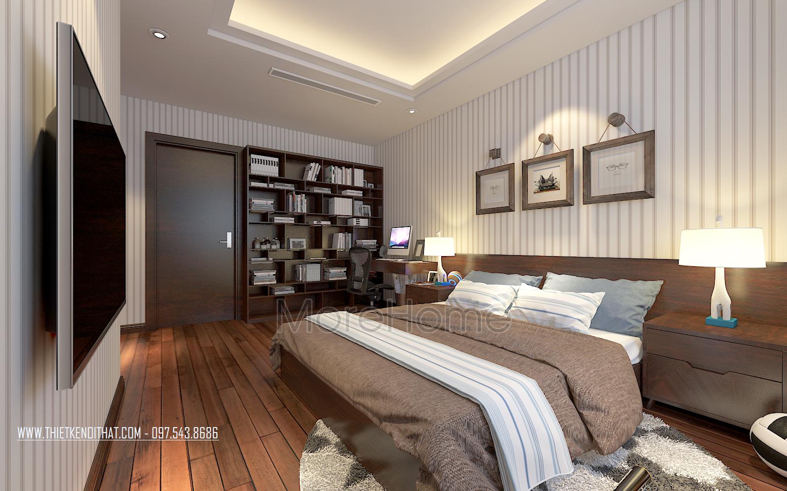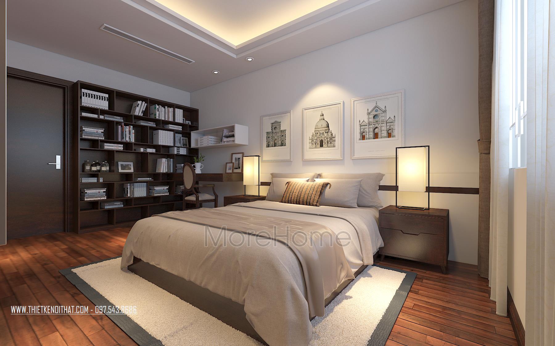 Một trong 2 phòng ngủ thiết kế theo phong cách hiện đại với khá đơn giản, mang vẻ đẹp năng động và ấm áp. Tone màu nâu trầm khéo léo tạo hiệu ứng cảm xúc tích cực, gợi sự yên bình và an toàn. Thiết kế tường thô đơn sắc được kiến trúc sư thay bằng thiết kế sử dụng giấy dán tường hoa văn đơn giản, tăng tính linh hoạt cho căn phòng, thay đổi cũng khá dễ dàng. Tủ và kệ gỗ được kết hợp khéo léo vừa đảm bảo tính công năng lại không làm mất đi nét đẹp thẩm mỹ.