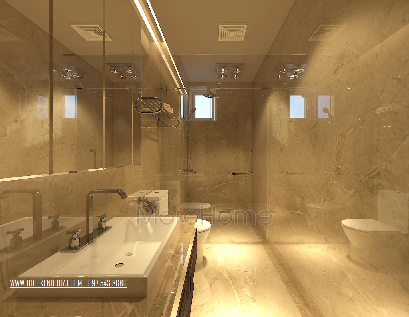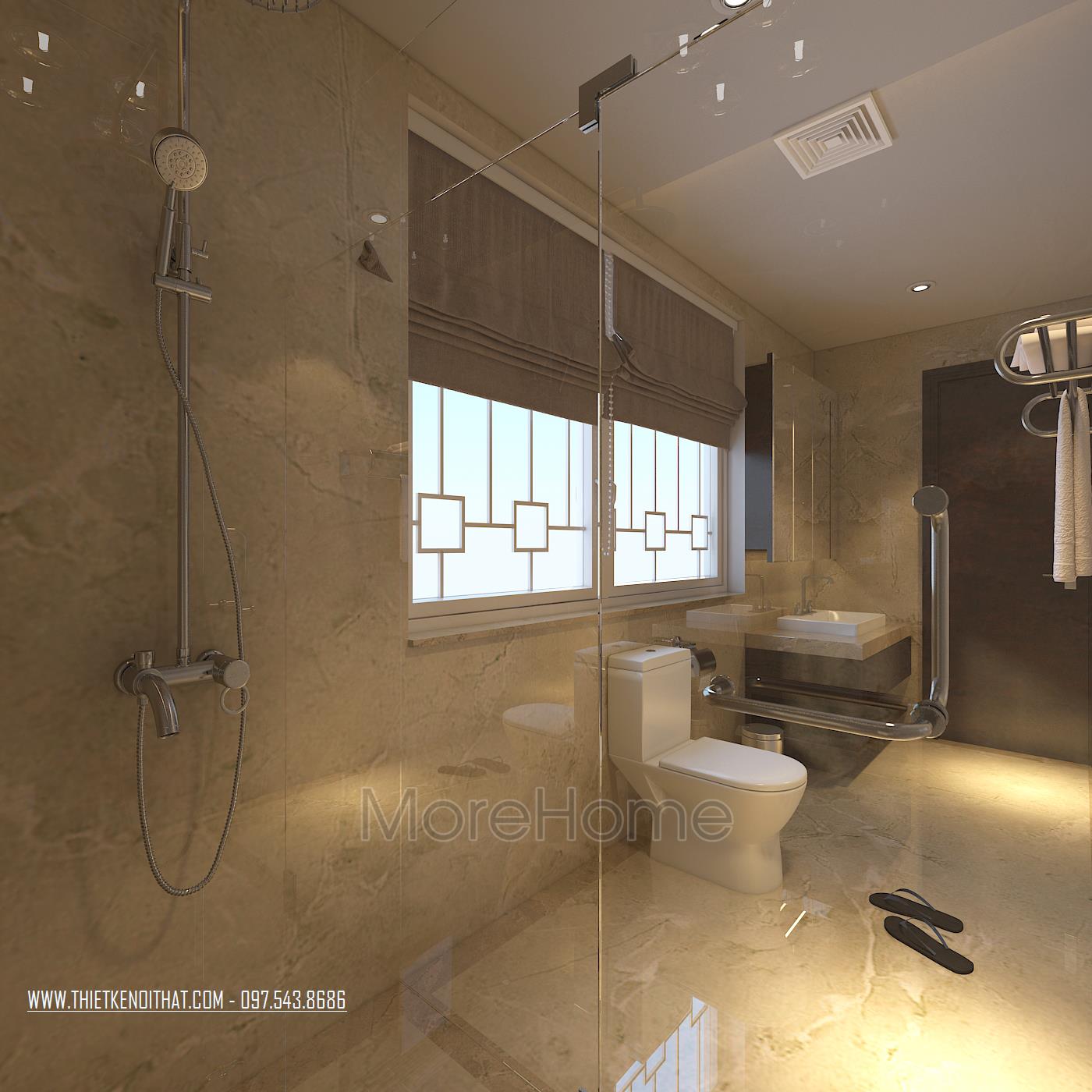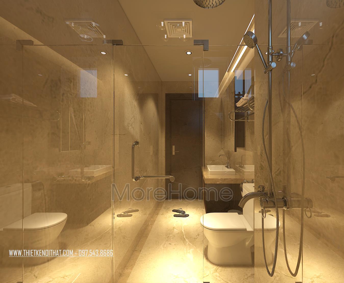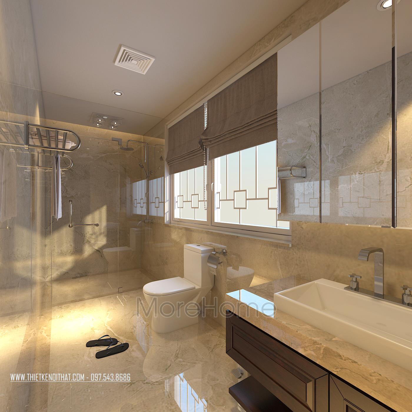 Cuối cùng là thiết kế nội thất phòng tắm hiện đại. Các vật liệu nhẹ được ưu ái sử dụng nhằm tạo cảm giác mở và thông suốt cho không gian. Bạn có nhu cầu thiết kế nội thất và thi công biệt thự VinHomes Thăng Long vui lòng liên hệ: 0975438686 để được tư vấn chi tiết và nhận bản vẽ 3D để có thể lựa chọn cho mình những phong cách thiết kế nội thất phù hợp nhất với không gian căn nhà của bạn. Morehome là đơn vị uy tín hàng đầu chuyên về lĩnh vực thiết kế thi công nội thất trọn gói tất cả các công trình. Bạn có thể truy cập trực tiếp vào website: thietkenoithat.com để thấy được sự lựa chọn đơn vị thiết kế thi công của mình là hoàn toàn đúng đắn, Morehome luôn sẵng sàng đồng hành cùng bạn.