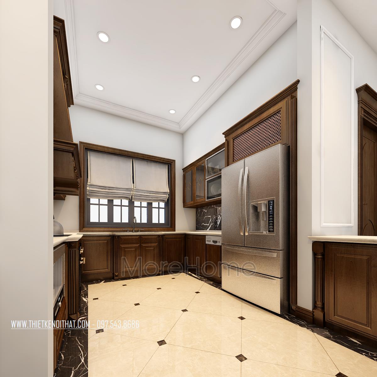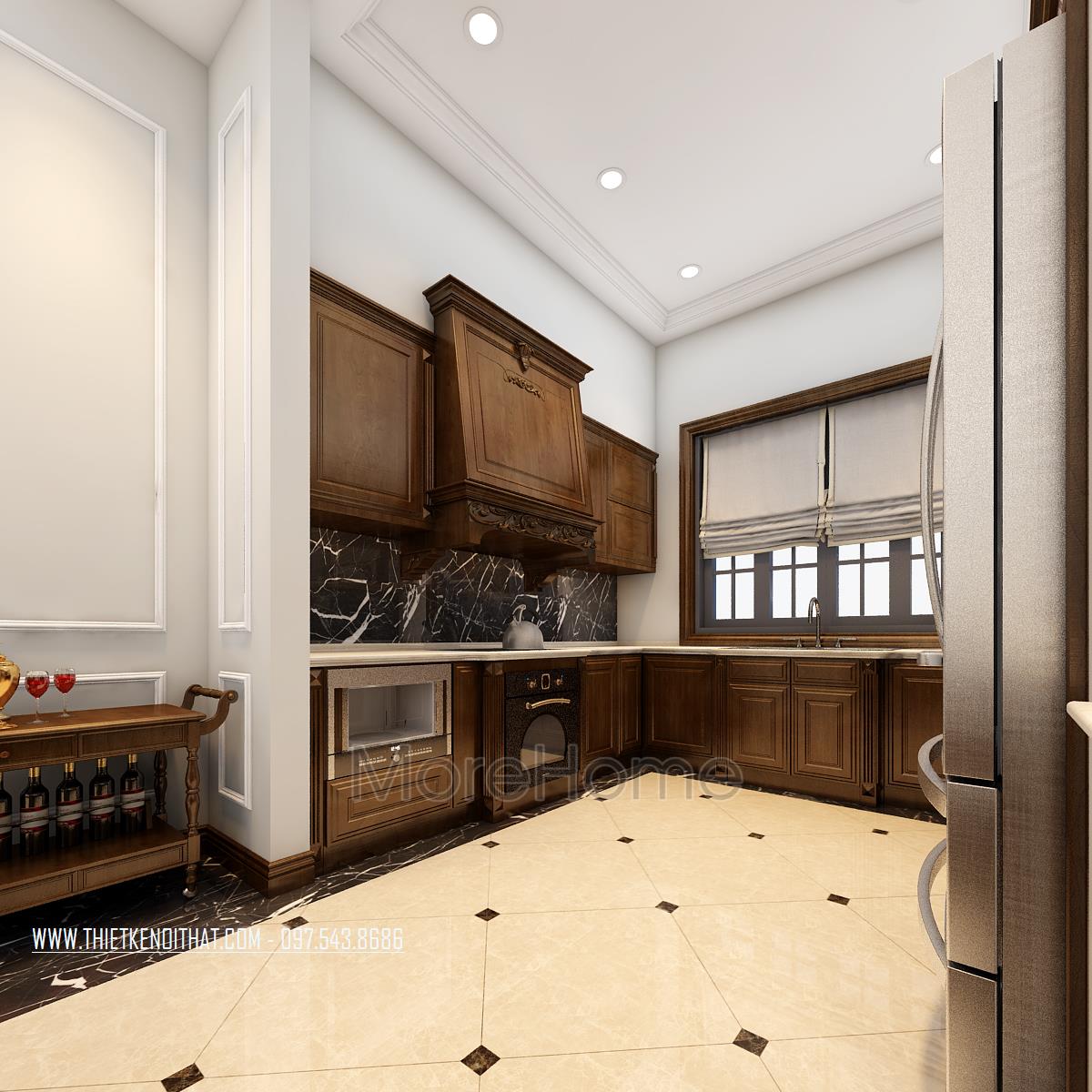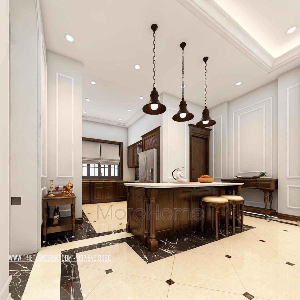 Tiếp theo là thiết kế nội thất bếp và phòng ăn tân cổ điển, tone màu nâu trầm ấm áp và gần gũi vẫn là màu sắc được kiến trúc sư ưu ái lựa chọn mang đến sự đồng nhất và góp phần lớn thể hiện tính nhất quán trong thiết kế.