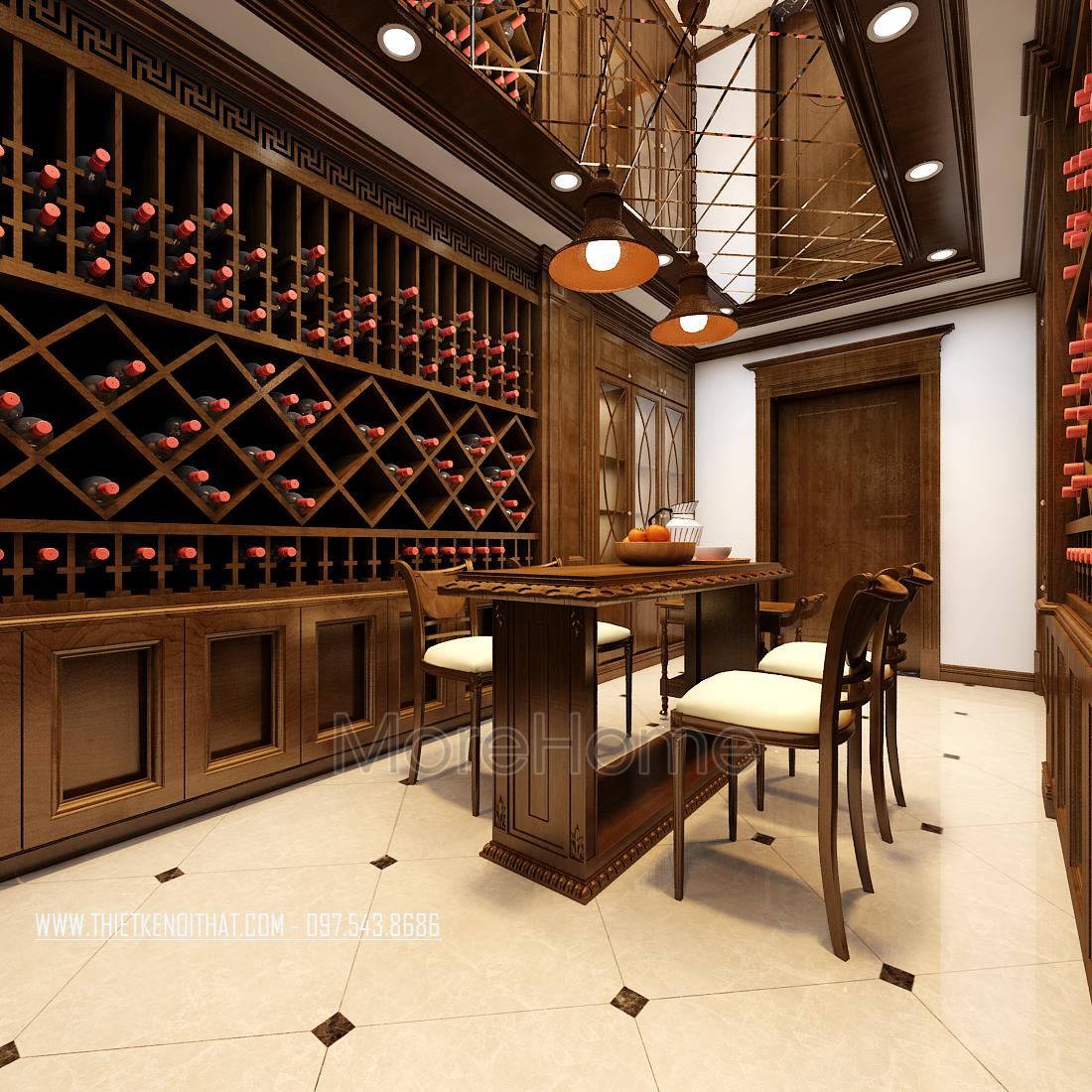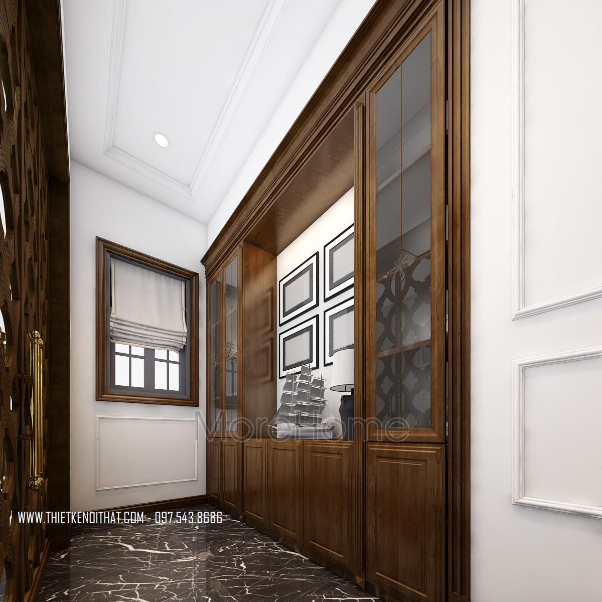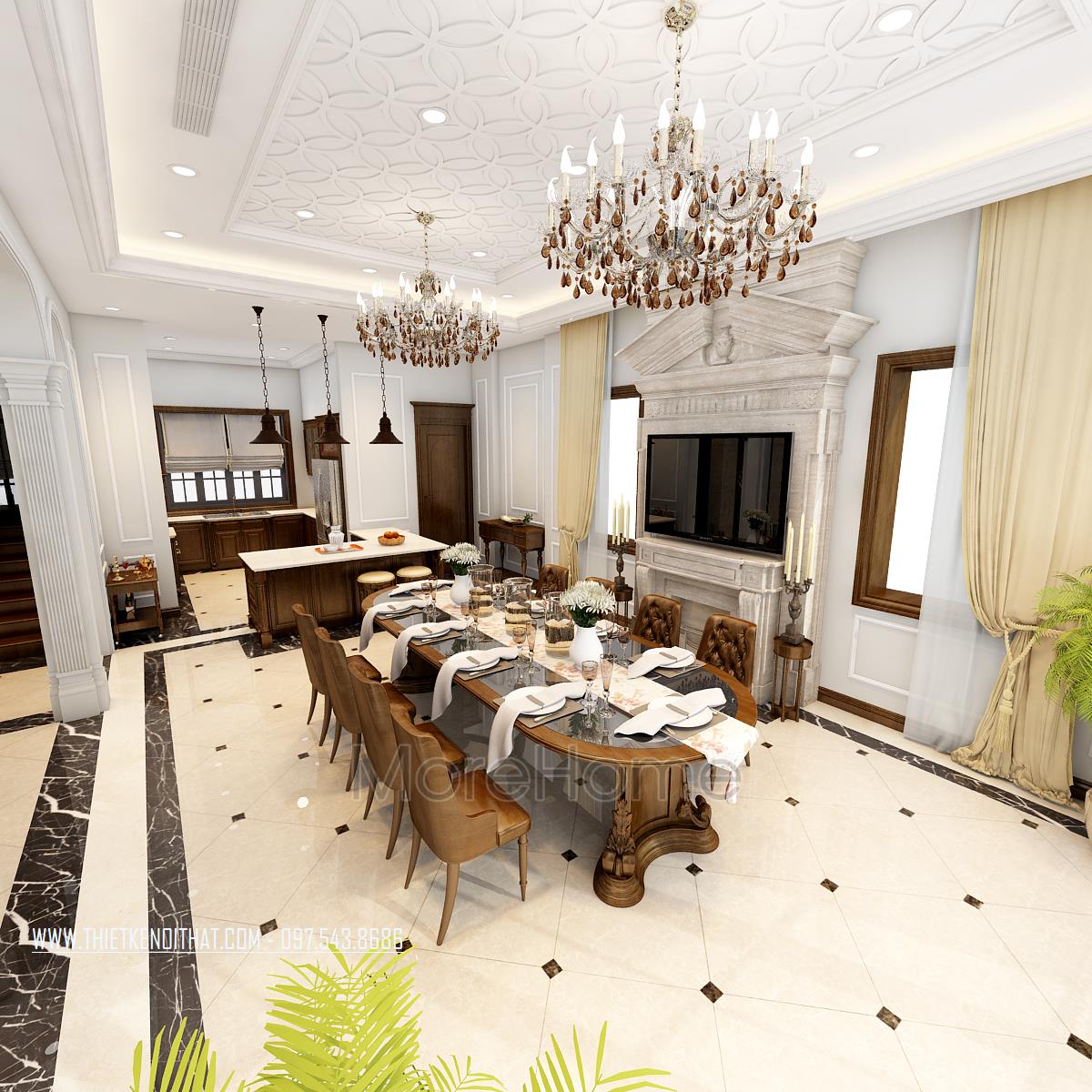 Tiếp theo là thiết kế nội thất bếp và phòng ăn tân cổ điển, tone màu nâu trầm ấm áp và gần gũi vẫn là màu sắc được kiến trúc sư ưu ái lựa chọn mang đến sự đồng nhất và góp phần lớn thể hiện tính nhất quán trong thiết kế.