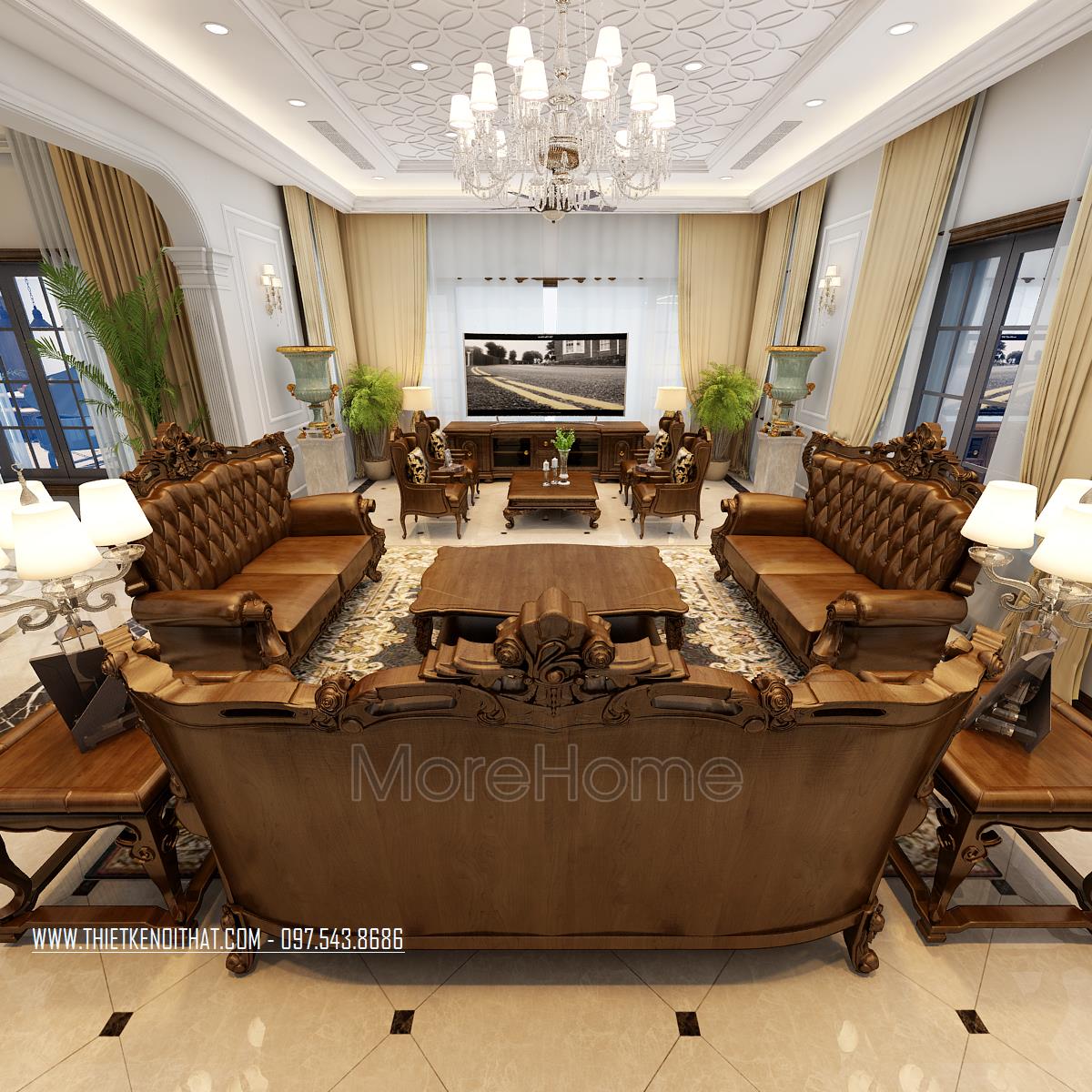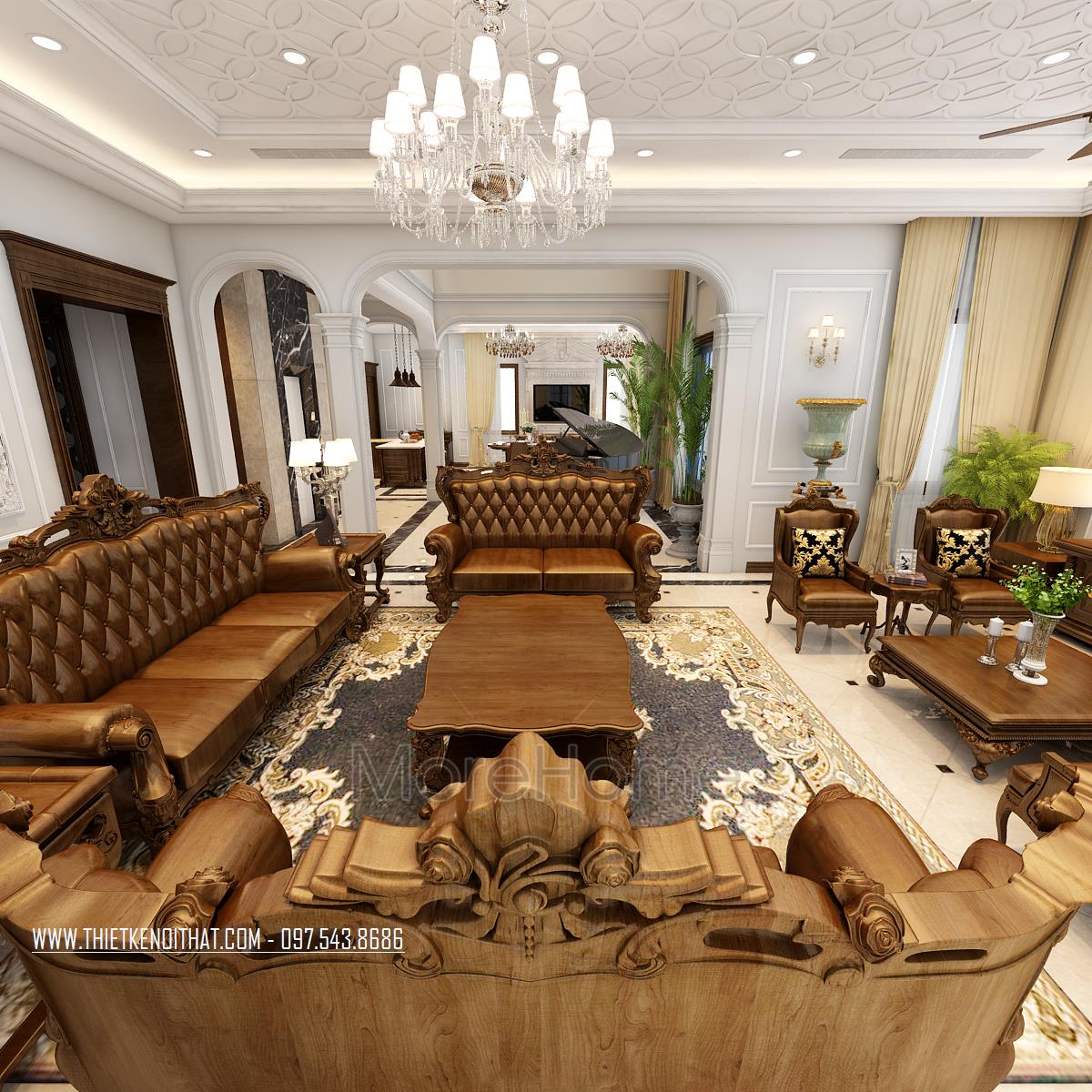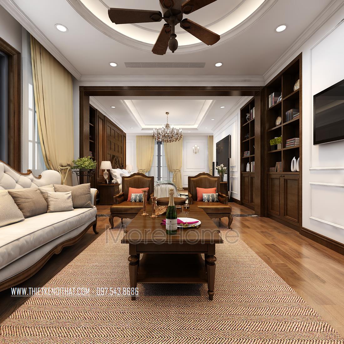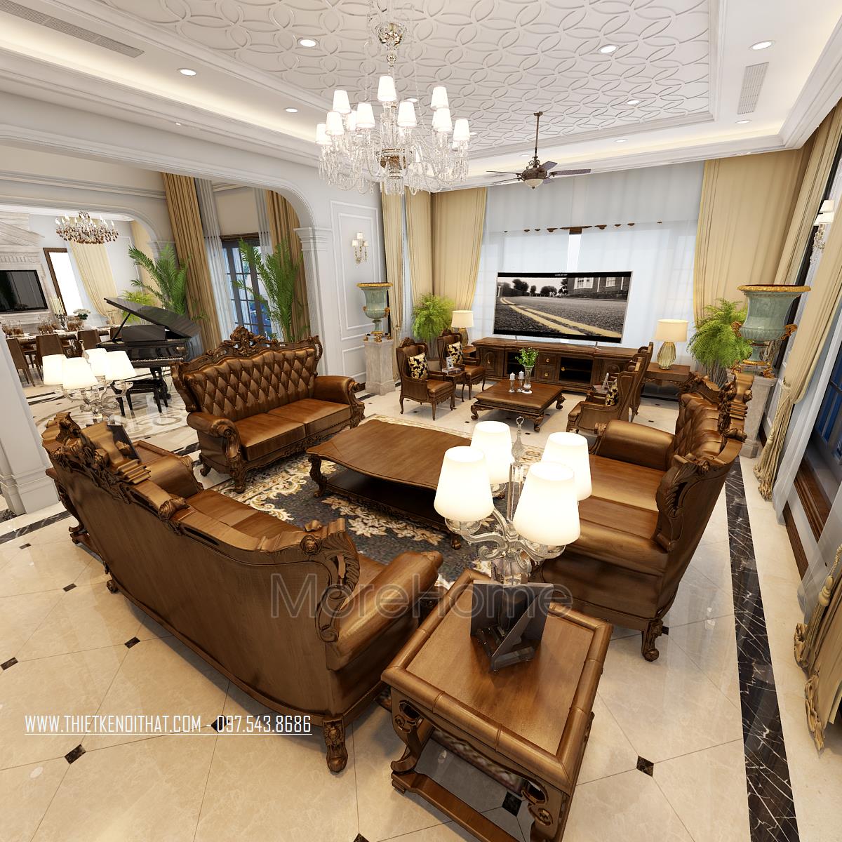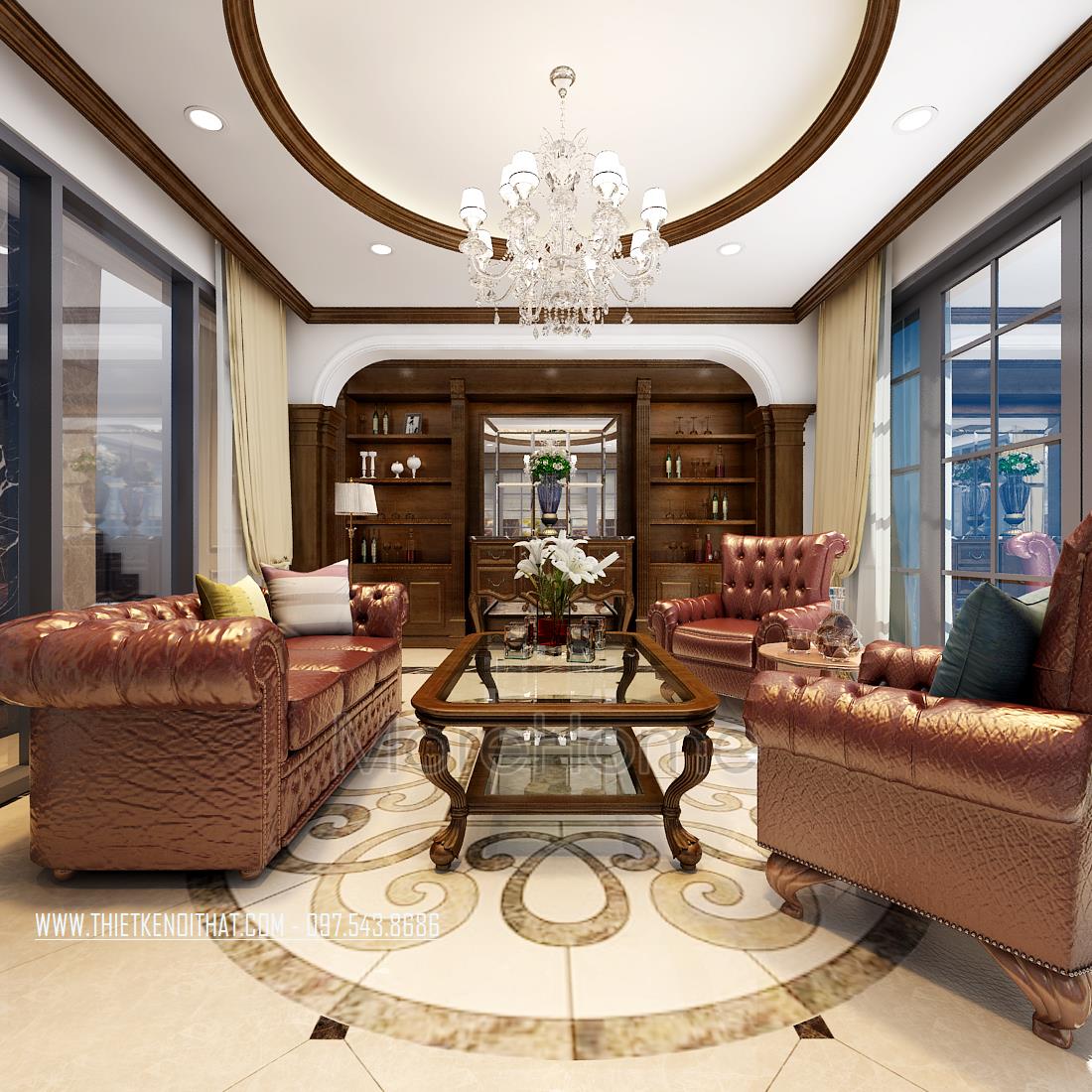 Thiết kế nội thất biệt thự Xuân Phương làm một trong những thiết kế nổi bật cho phong cách đó. Thiết kế nội thất phòng khách phong cách tân cổ điển sử dụng tone màu nâu trầm ấm áp làm chủ đạo gợi cảm giác gần gũi và thân thiện. Sắc nâu cổ điển cũng là một trong những màu sắc sang trọng thể hiện sự quý phái mà gia chủ ưa thích. Điểm nổi bật của không gian này chính là các thiết kế trạm khắc ấn tượng, không gian nội thất tân cổ điển đặc biệt sử dụng gỗ và da làm vật liệu chính cho thiết kế sofa. Bộ sofa to, rộng thể hiện sự bề thế của căn phòng.