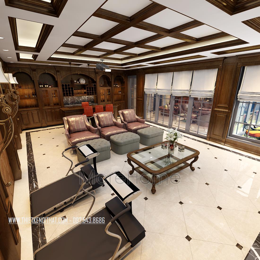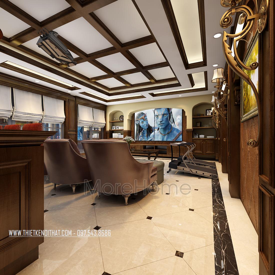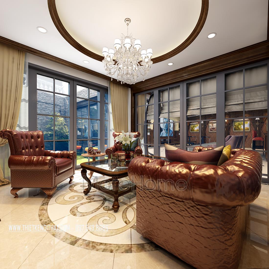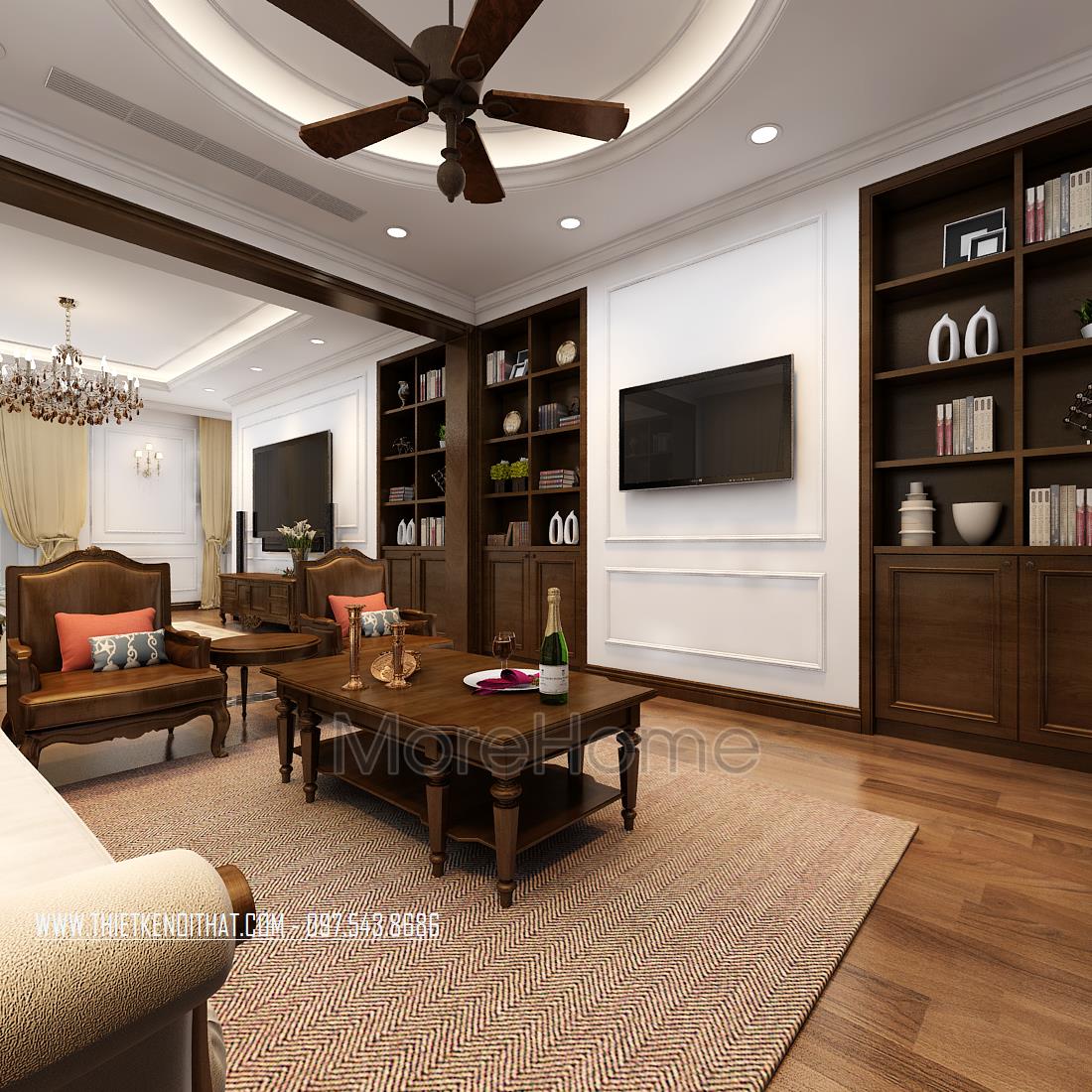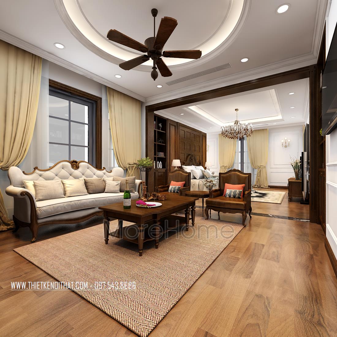 Thiết kế nội thất biệt thự Xuân Phương làm một trong những thiết kế nổi bật cho phong cách đó. Thiết kế nội thất phòng khách phong cách tân cổ điển sử dụng tone màu nâu trầm ấm áp làm chủ đạo gợi cảm giác gần gũi và thân thiện. Sắc nâu cổ điển cũng là một trong những màu sắc sang trọng thể hiện sự quý phái mà gia chủ ưa thích. Điểm nổi bật của không gian này chính là các thiết kế trạm khắc ấn tượng, không gian nội thất tân cổ điển đặc biệt sử dụng gỗ và da làm vật liệu chính cho thiết kế sofa. Bộ sofa to, rộng thể hiện sự bề thế của căn phòng.
