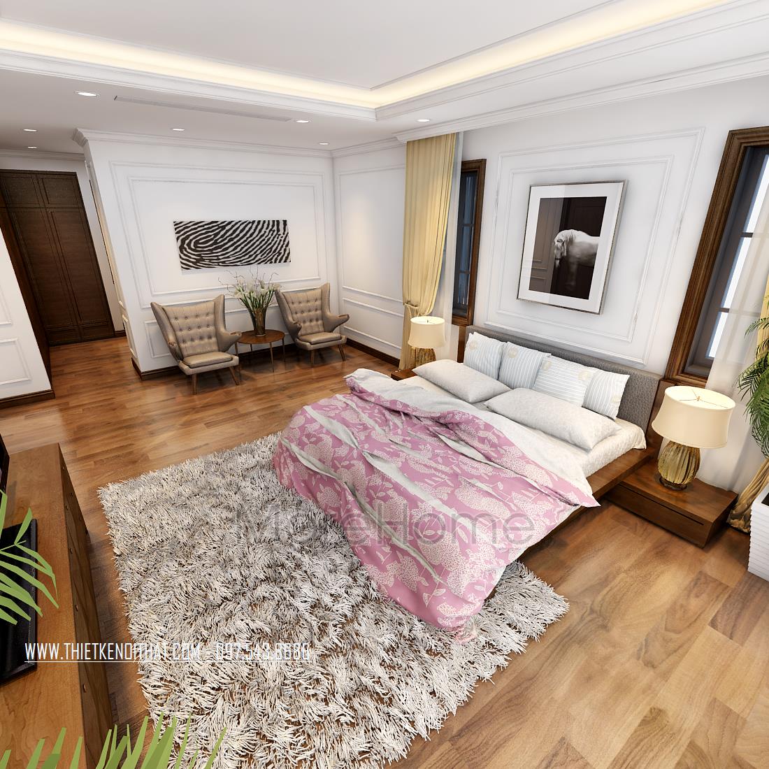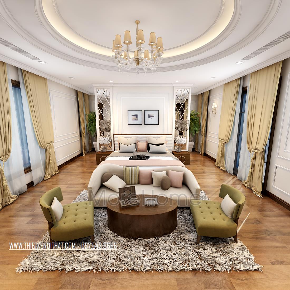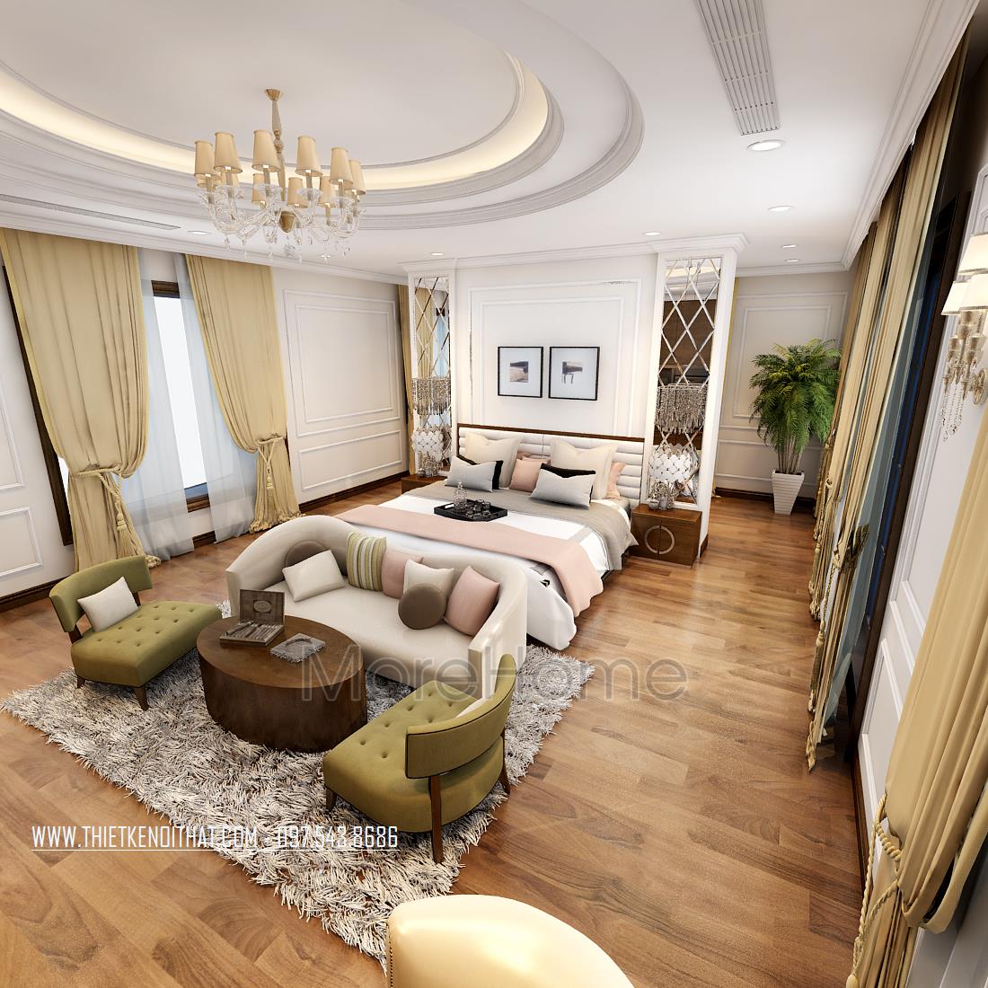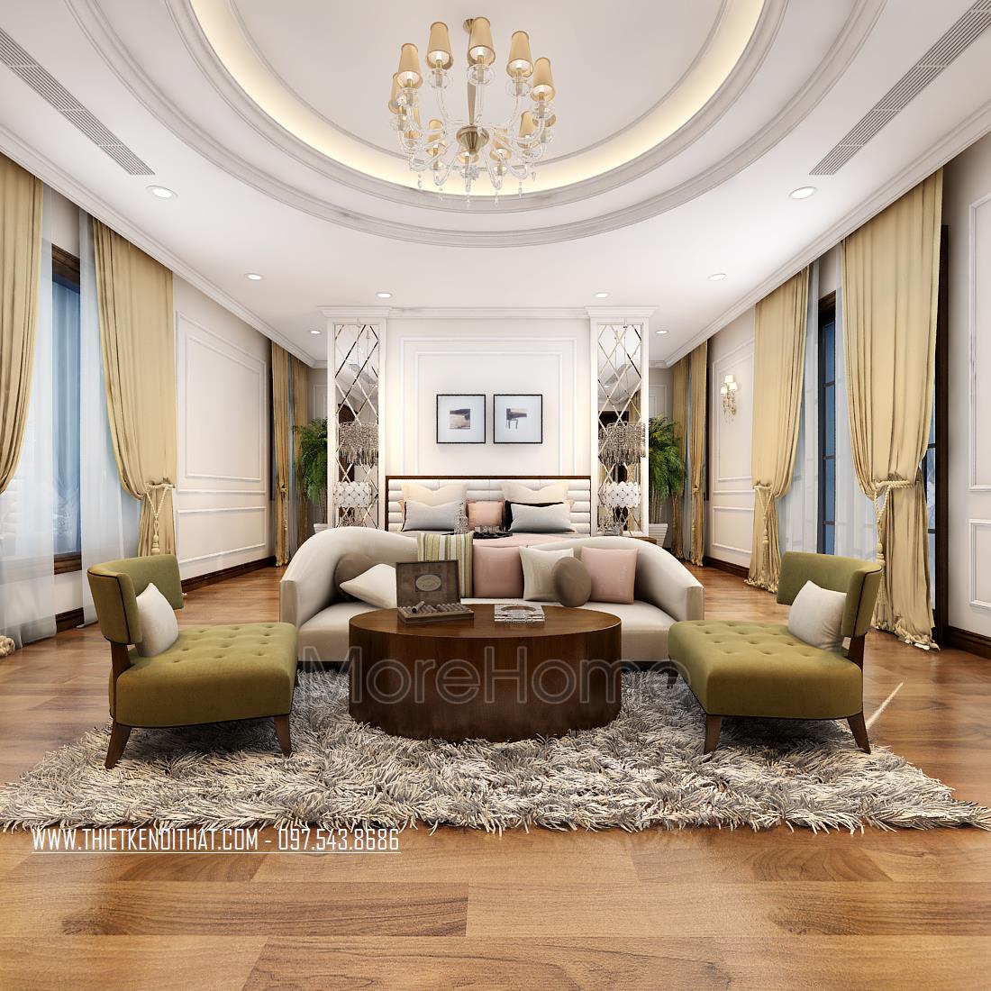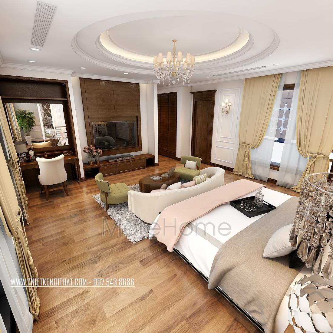 Tiếp theo là thiết kế nội thất phòng ngủ Master phong cách tân cổ điển. Điều dễ nhận thấy ở đây là thiết kế tích hợp nhiều không gian, từ nơi tiếp khách, không gian làm việc đến tủ quần áo và không giant hay đồ. Các khu vực không hề bị chia cắt bởi tường thô cứng nhắc mà thay vào đó là các thiết kế vách ngăn hoa văn tinh xảo, nhẹ nhàng vừa đảm bảo tính thẩm mỹ cho căn phòng mà vẫn giúp tiết kiệm diện tích sử dụng. Thiết kế đối xứng với tone màu nhẹ nhàng như xanh rêu, be, ghi sáng là các tone màu được kiến trúc sư lựa chọn cho căn phòng.