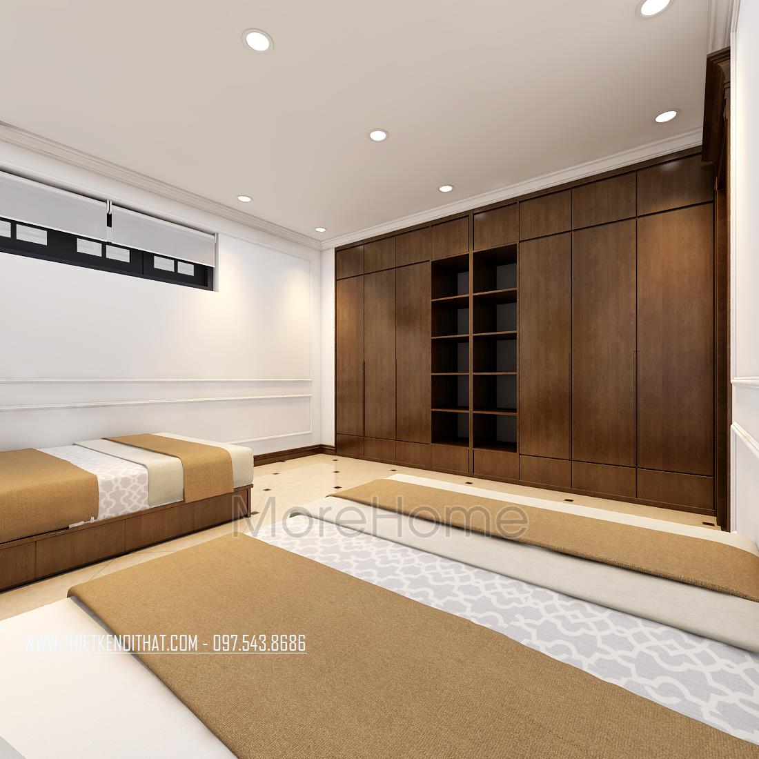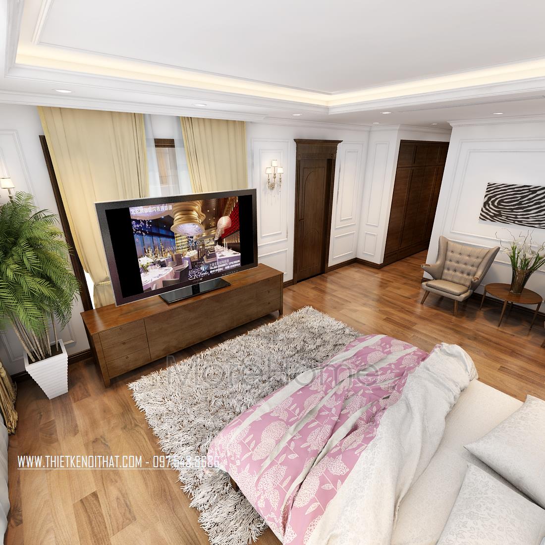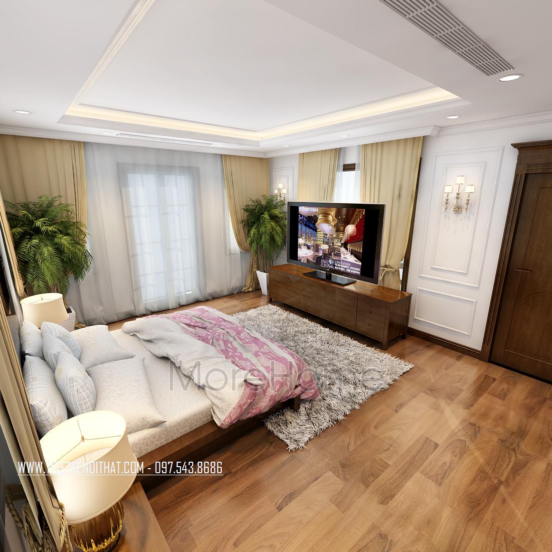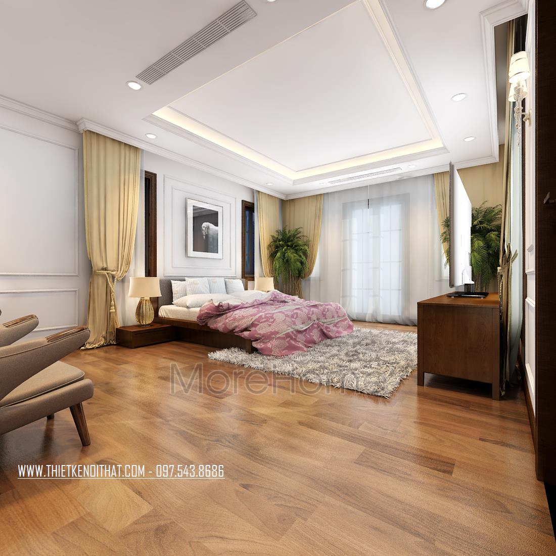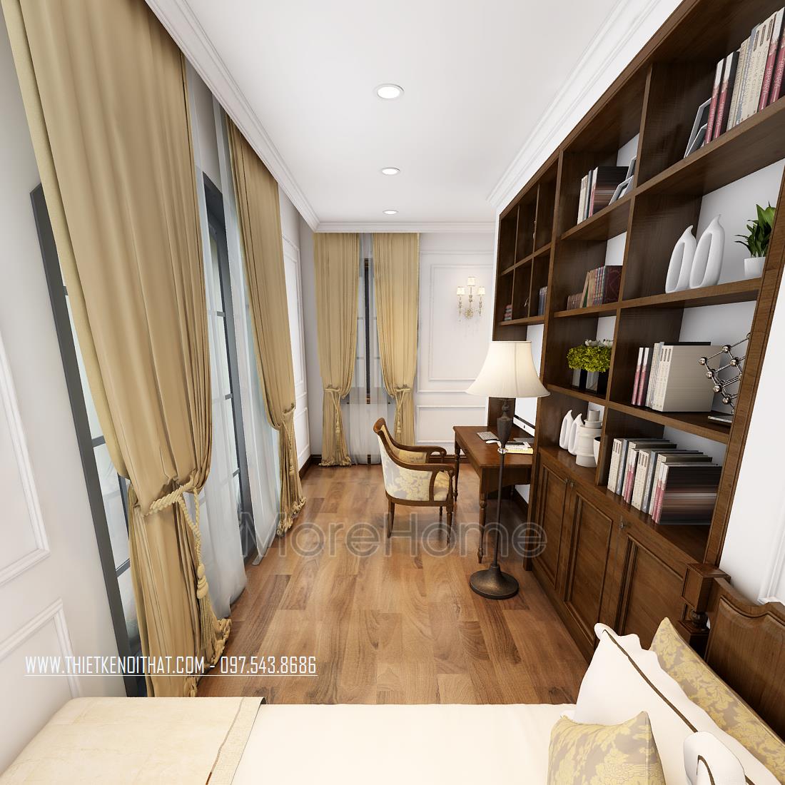 Tiếp theo là thiết kế nội thất phòng ngủ Master phong cách tân cổ điển. Điều dễ nhận thấy ở đây là thiết kế tích hợp nhiều không gian, từ nơi tiếp khách, không gian làm việc đến tủ quần áo và không giant hay đồ. Các khu vực không hề bị chia cắt bởi tường thô cứng nhắc mà thay vào đó là các thiết kế vách ngăn hoa văn tinh xảo, nhẹ nhàng vừa đảm bảo tính thẩm mỹ cho căn phòng mà vẫn giúp tiết kiệm diện tích sử dụng. Thiết kế đối xứng với tone màu nhẹ nhàng như xanh rêu, be, ghi sáng là các tone màu được kiến trúc sư lựa chọn cho căn phòng.