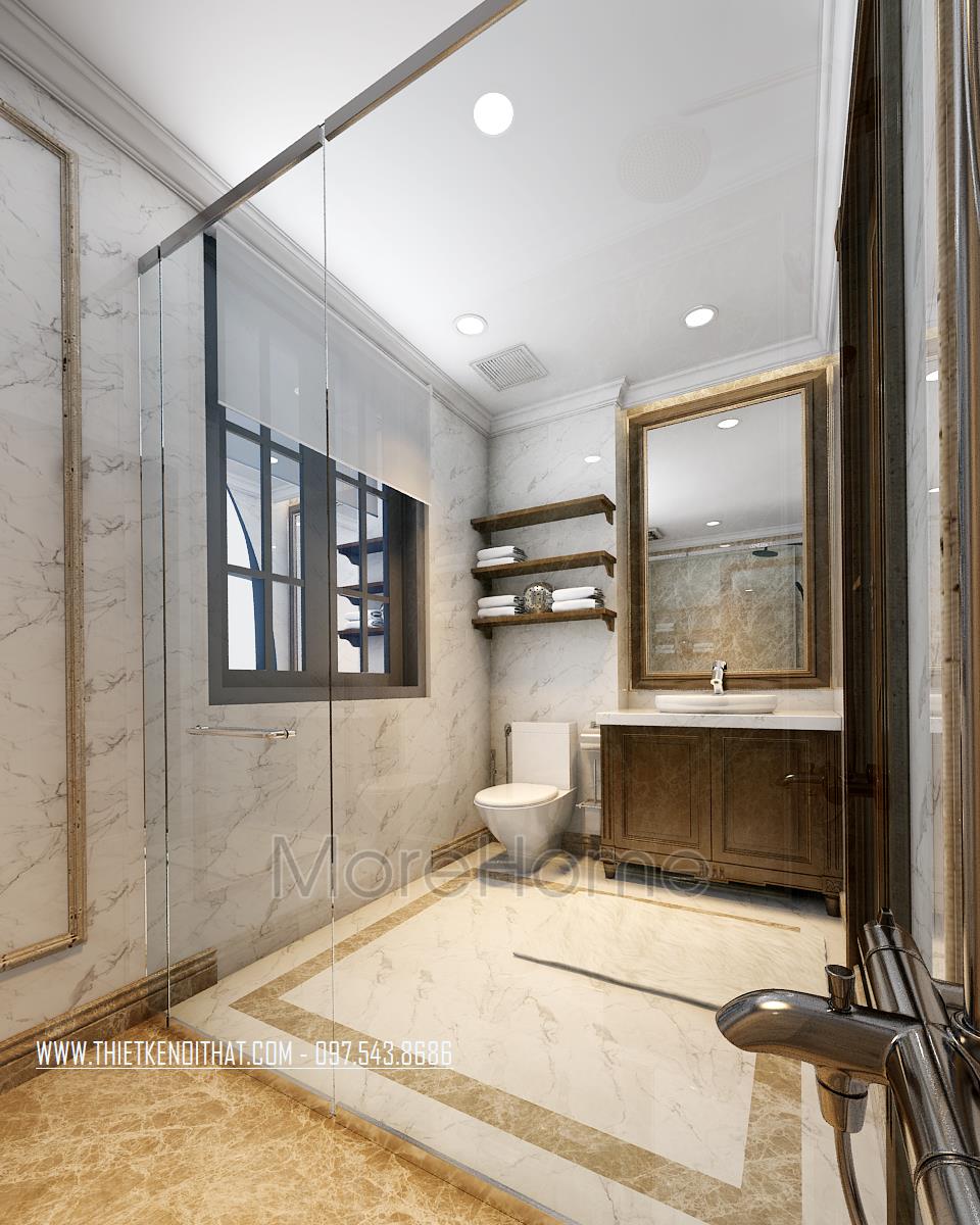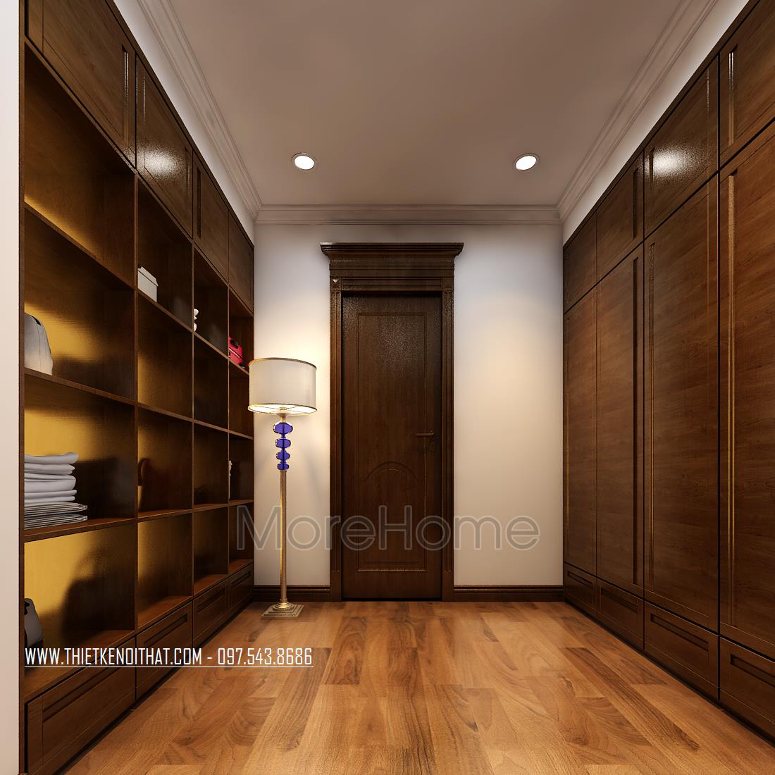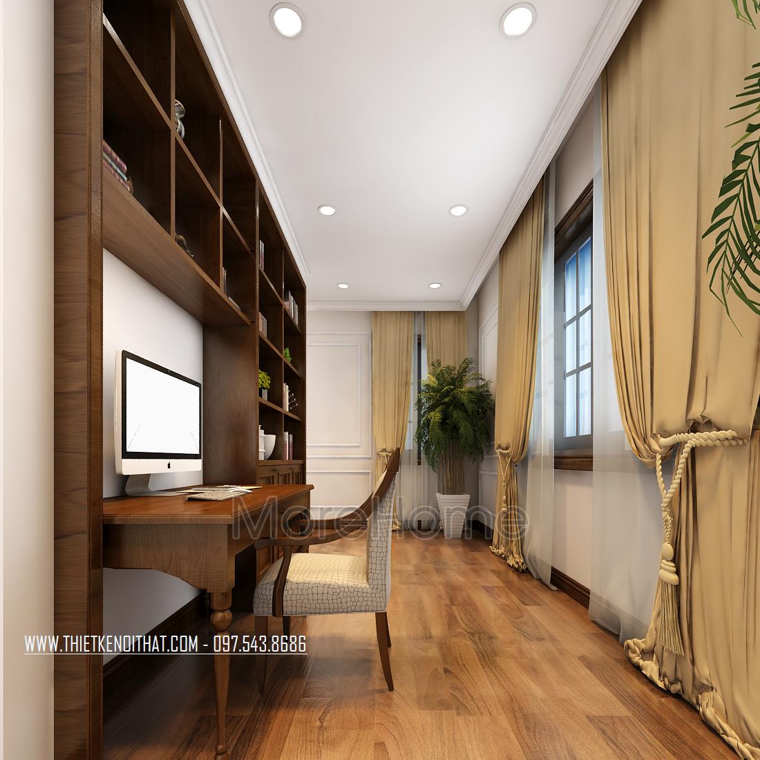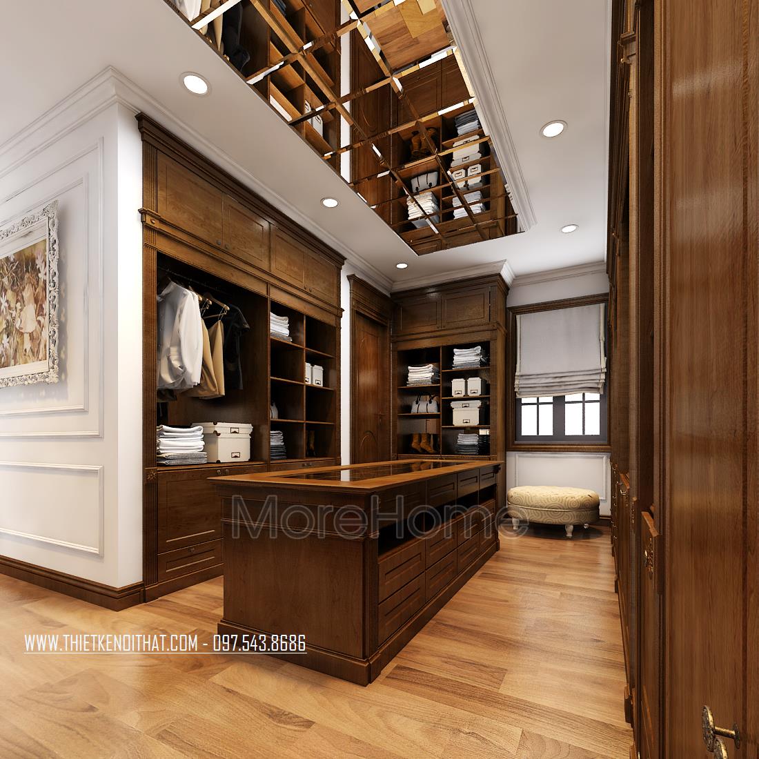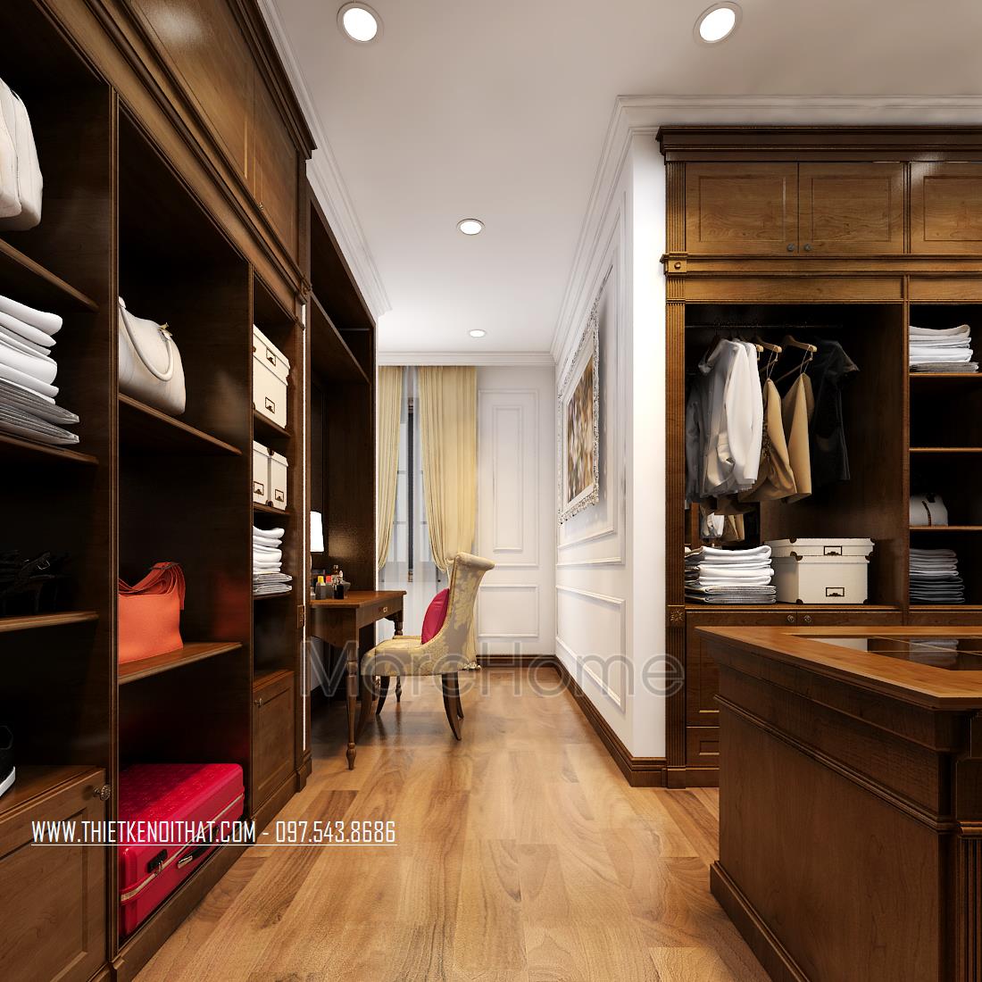 Tiếp theo là thiết kế nội thất phòng ngủ Master phong cách tân cổ điển. Điều dễ nhận thấy ở đây là thiết kế tích hợp nhiều không gian, từ nơi tiếp khách, không gian làm việc đến tủ quần áo và không giant hay đồ. Các khu vực không hề bị chia cắt bởi tường thô cứng nhắc mà thay vào đó là các thiết kế vách ngăn hoa văn tinh xảo, nhẹ nhàng vừa đảm bảo tính thẩm mỹ cho căn phòng mà vẫn giúp tiết kiệm diện tích sử dụng. Thiết kế đối xứng với tone màu nhẹ nhàng như xanh rêu, be, ghi sáng là các tone màu được kiến trúc sư lựa chọn cho căn phòng.