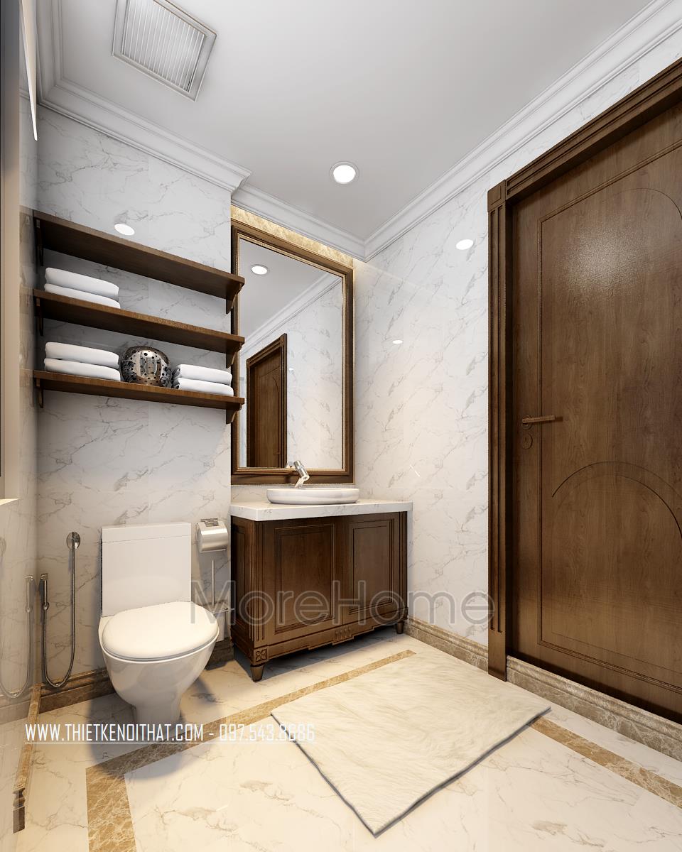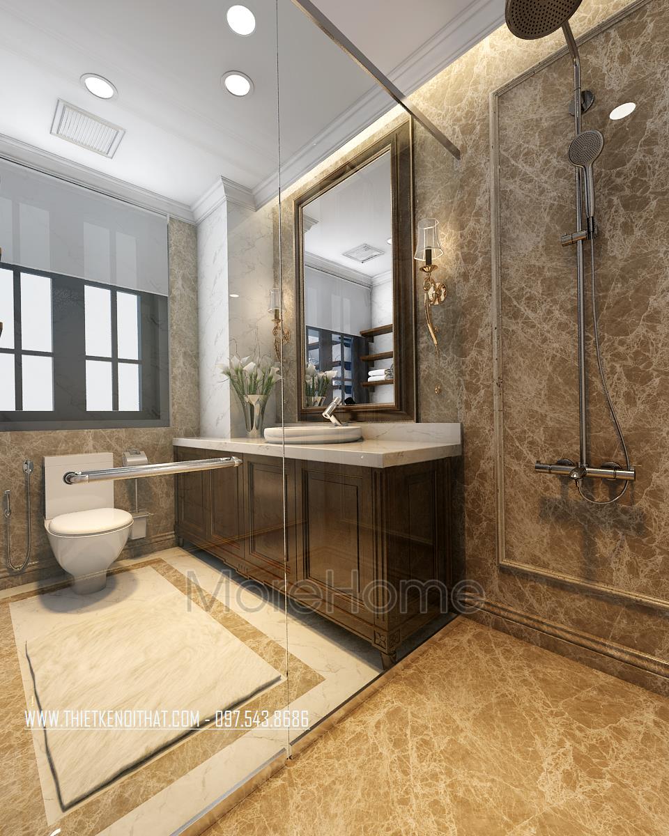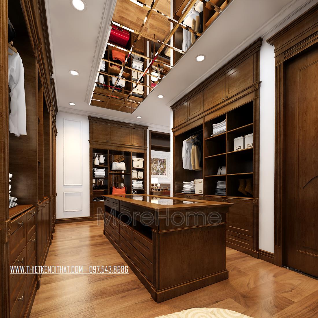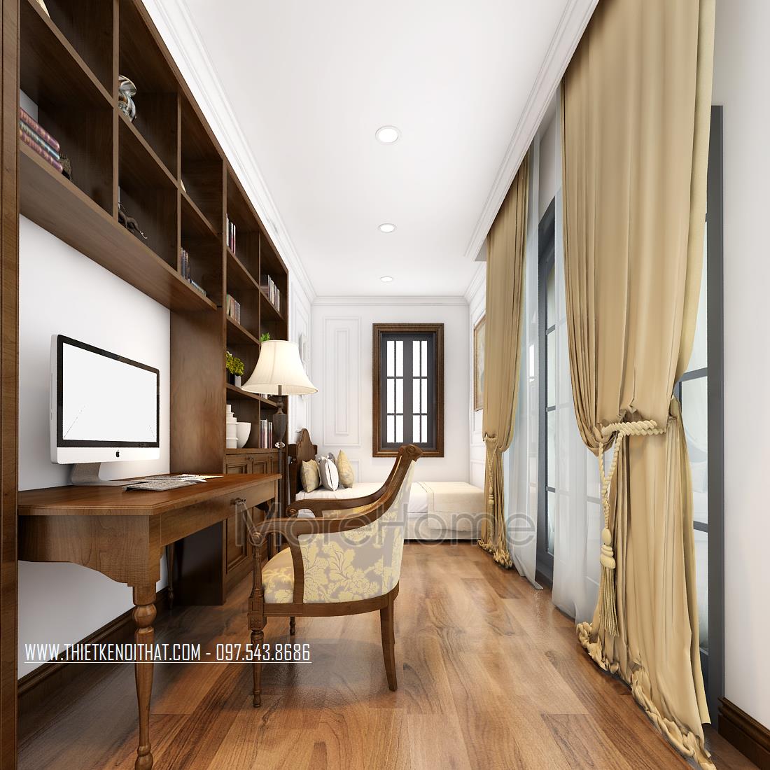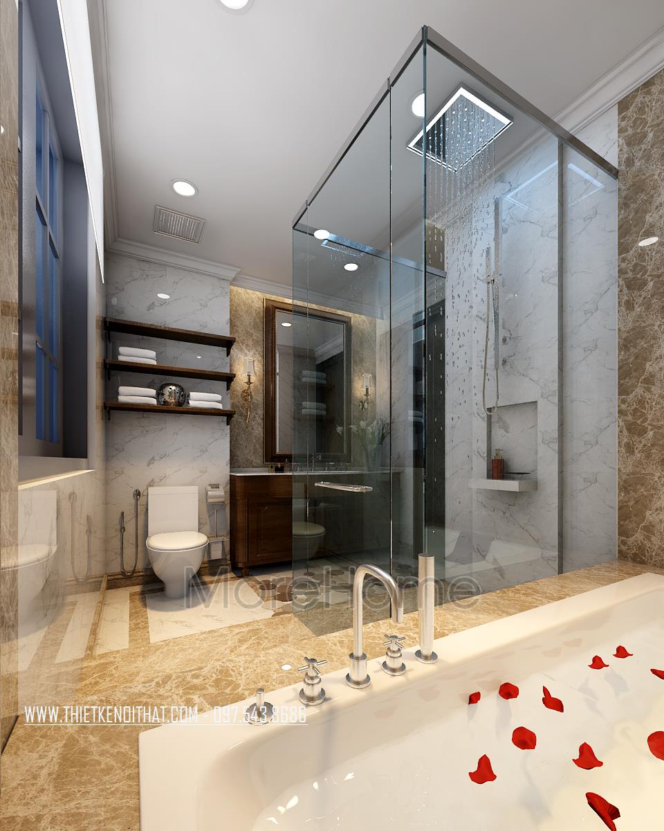 Tiếp theo là thiết kế nội thất phòng ngủ Master phong cách tân cổ điển. Điều dễ nhận thấy ở đây là thiết kế tích hợp nhiều không gian, từ nơi tiếp khách, không gian làm việc đến tủ quần áo và không giant hay đồ. Các khu vực không hề bị chia cắt bởi tường thô cứng nhắc mà thay vào đó là các thiết kế vách ngăn hoa văn tinh xảo, nhẹ nhàng vừa đảm bảo tính thẩm mỹ cho căn phòng mà vẫn giúp tiết kiệm diện tích sử dụng. Thiết kế đối xứng với tone màu nhẹ nhàng như xanh rêu, be, ghi sáng là các tone màu được kiến trúc sư lựa chọn cho căn phòng.