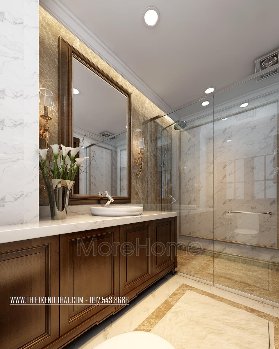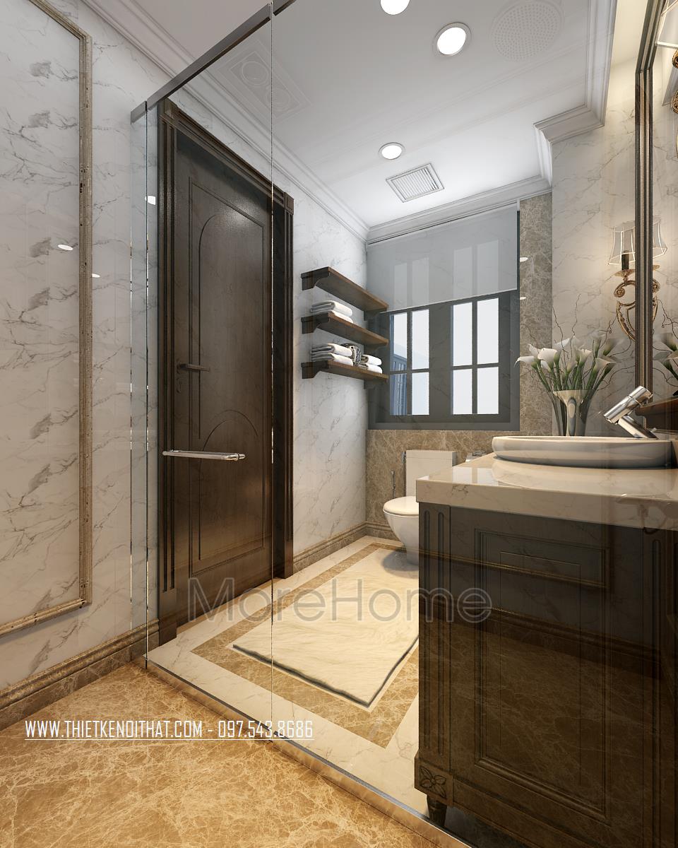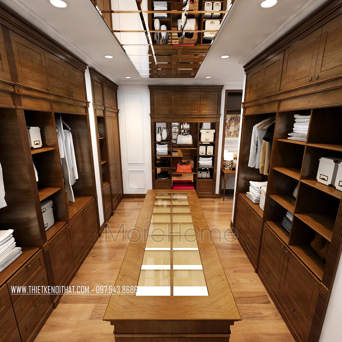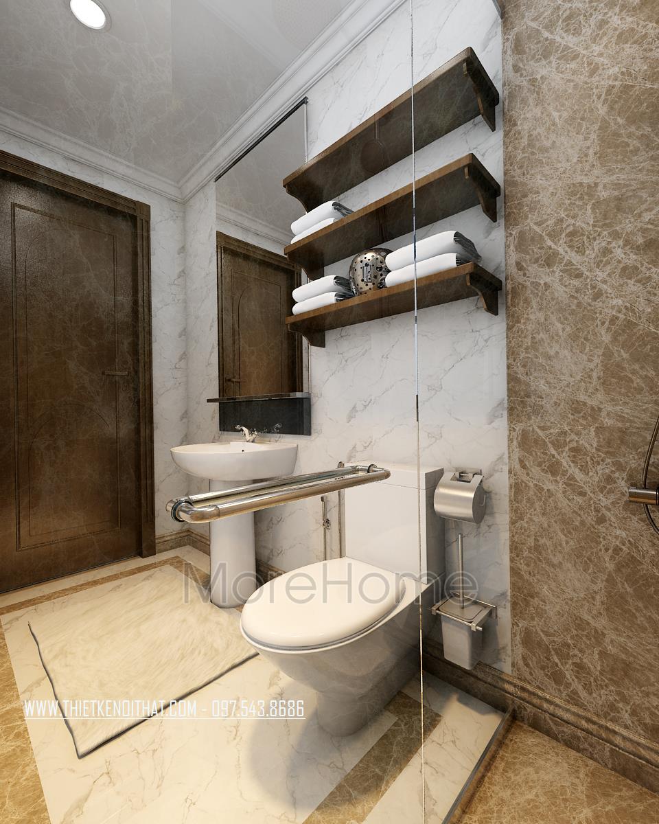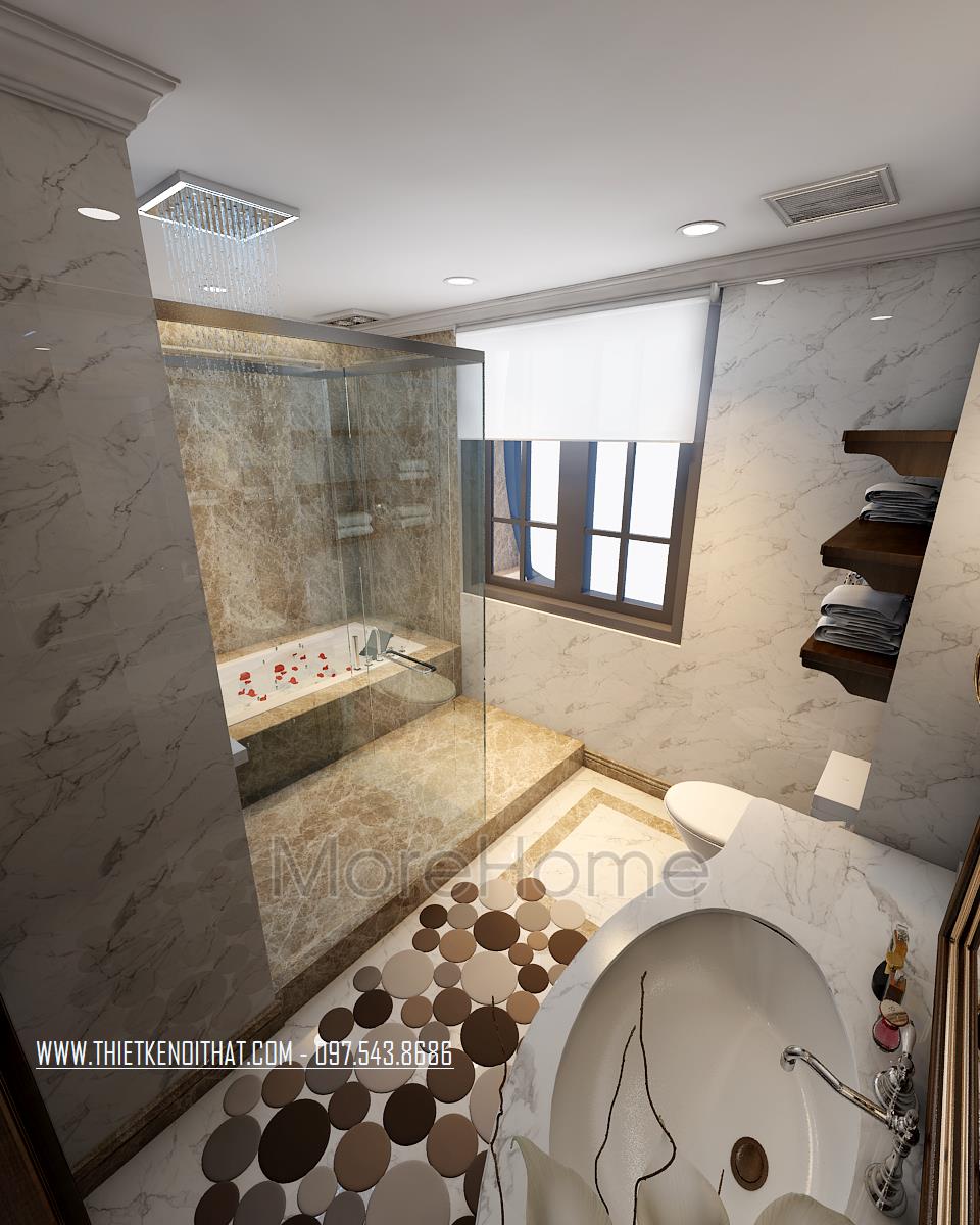 Tiếp theo là thiết kế nội thất phòng ngủ Master phong cách tân cổ điển. Điều dễ nhận thấy ở đây là thiết kế tích hợp nhiều không gian, từ nơi tiếp khách, không gian làm việc đến tủ quần áo và không giant hay đồ. Các khu vực không hề bị chia cắt bởi tường thô cứng nhắc mà thay vào đó là các thiết kế vách ngăn hoa văn tinh xảo, nhẹ nhàng vừa đảm bảo tính thẩm mỹ cho căn phòng mà vẫn giúp tiết kiệm diện tích sử dụng. Thiết kế đối xứng với tone màu nhẹ nhàng như xanh rêu, be, ghi sáng là các tone màu được kiến trúc sư lựa chọn cho căn phòng.