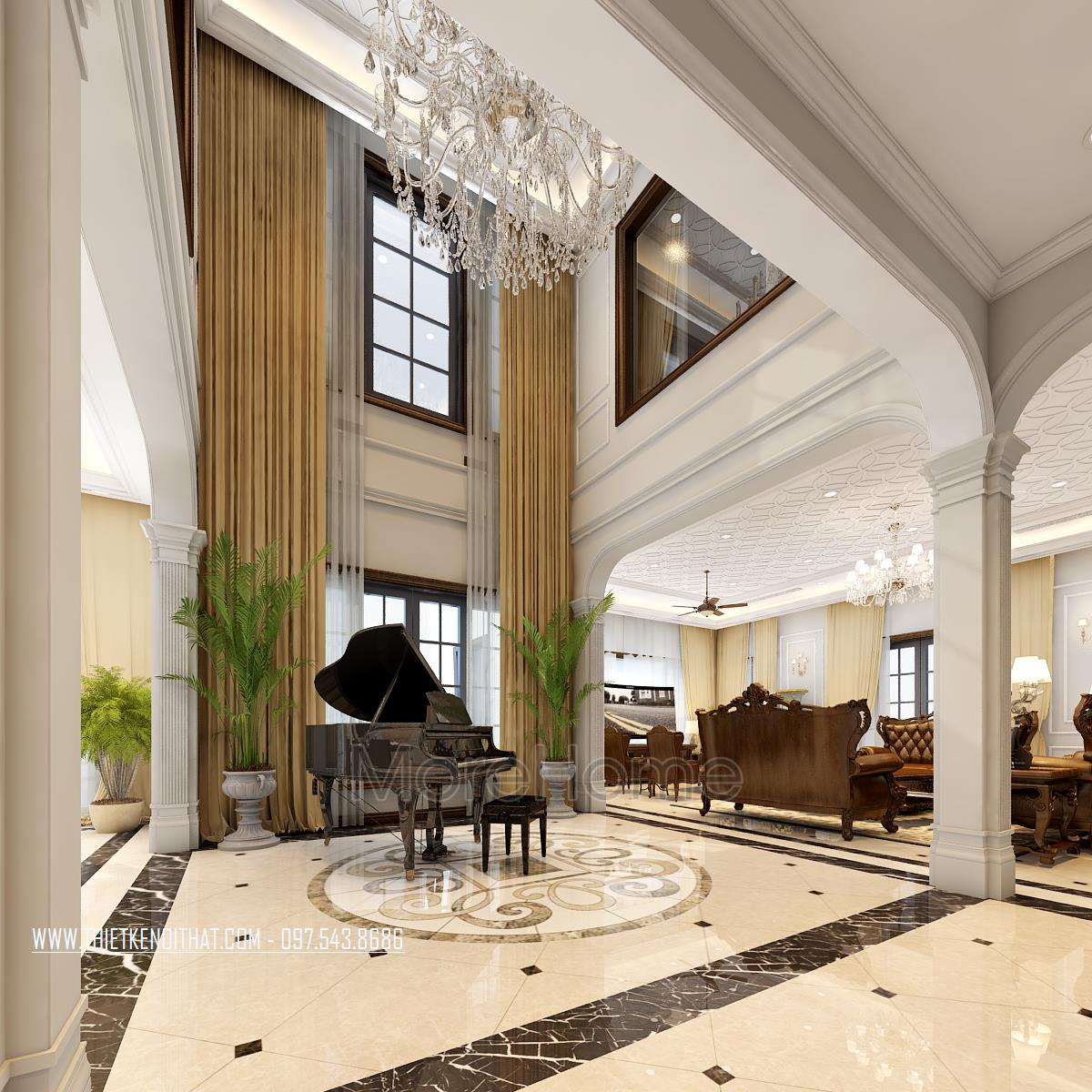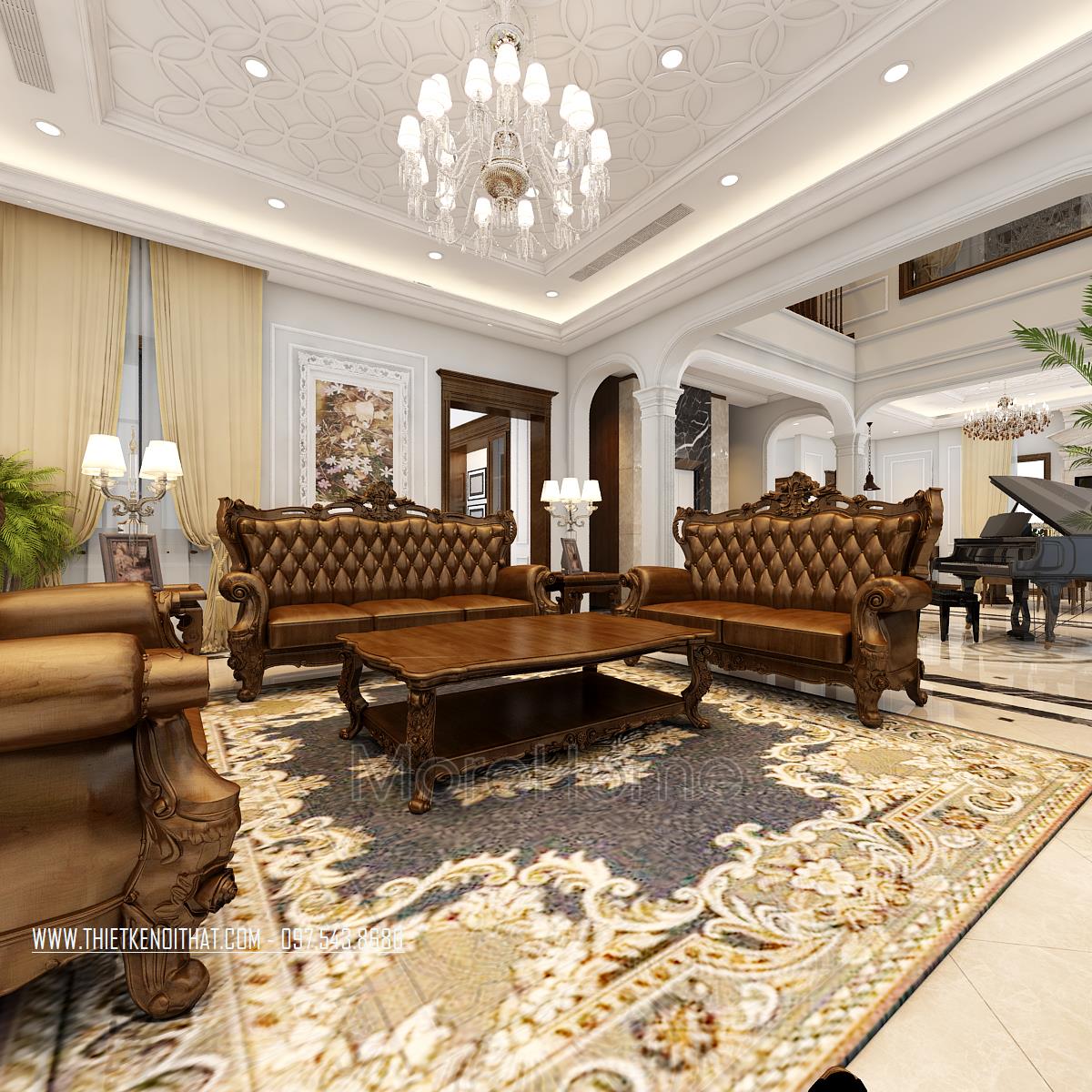 Không gian sinh hoạt được mở rộng, không hề bó hẹp trong bốn bức tường giúp kiến trúc sử thể hiện rõ lợi thế về mặt diện tích của căn nhà. Các chi tiết trang trí thêm như trần nhà khác biệt, thảm trải sàn với hoa văn thiết kế tỉ mỉ hay cách đặt các chậu cây nhỏ tạo không gian xanh,… đã tạo ra một không gian phòng khách hoàn hảo cho căn biệt thự.
