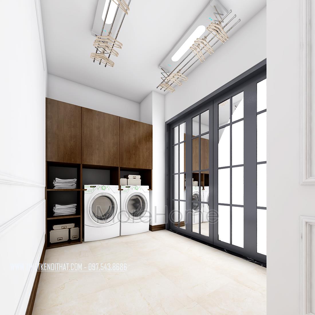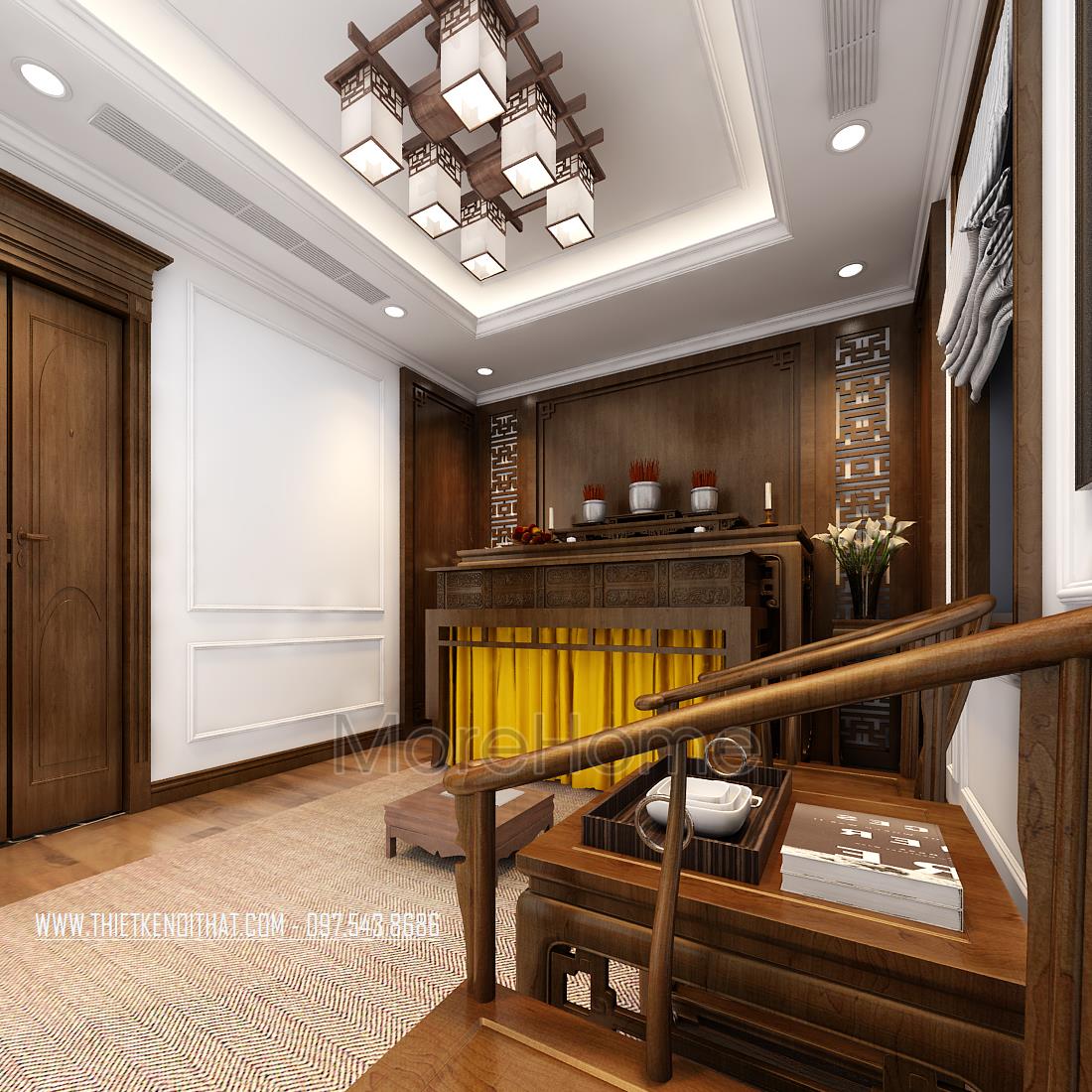 Cuối cùng là thiết kế nội thất không gian thờ cúng. Thiết kế không gian linh thiêng này được kiến trúc sư vô cùng cẩn trọng, từ việc kết hợp khéo léo các yếu tố thẩm mỹ đến cân nhắc cẩn thận các chi tiết liên quan đến phong thủy. Gỗ là vật liệu chính được sử dụng trong không gian này. Bàn thờ được đặt nghiêm trang với thiết kế đối xứng hai bên đảm bảo tính chất của không gian, gợi một nơi trang nghiêm, mang lại sự bình yên và thoải mái cho gia chủ.