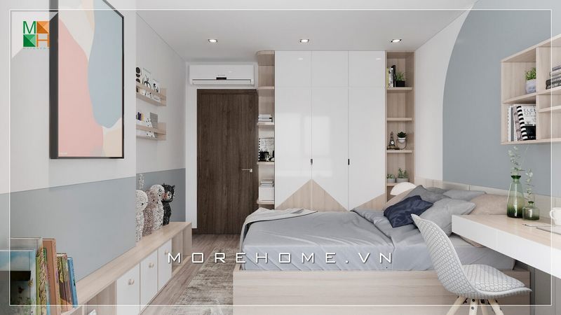Gia chủ đã chọn mẫu cửa gỗ công nghiệp An Cường với gam màu nâu cánh gián để làm cửa phòng ngủ, nhờ đó nó nổi bật.