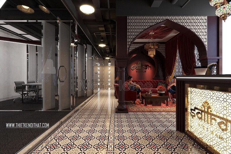 Sảnh chờ lễ tân được thiết kế theo phong cách Ấn Độ hiện đại với bộ sofa nỉ màu đỏ cao cấp, tạo nên một điểm nhấn nổi bật cho văn phòng.