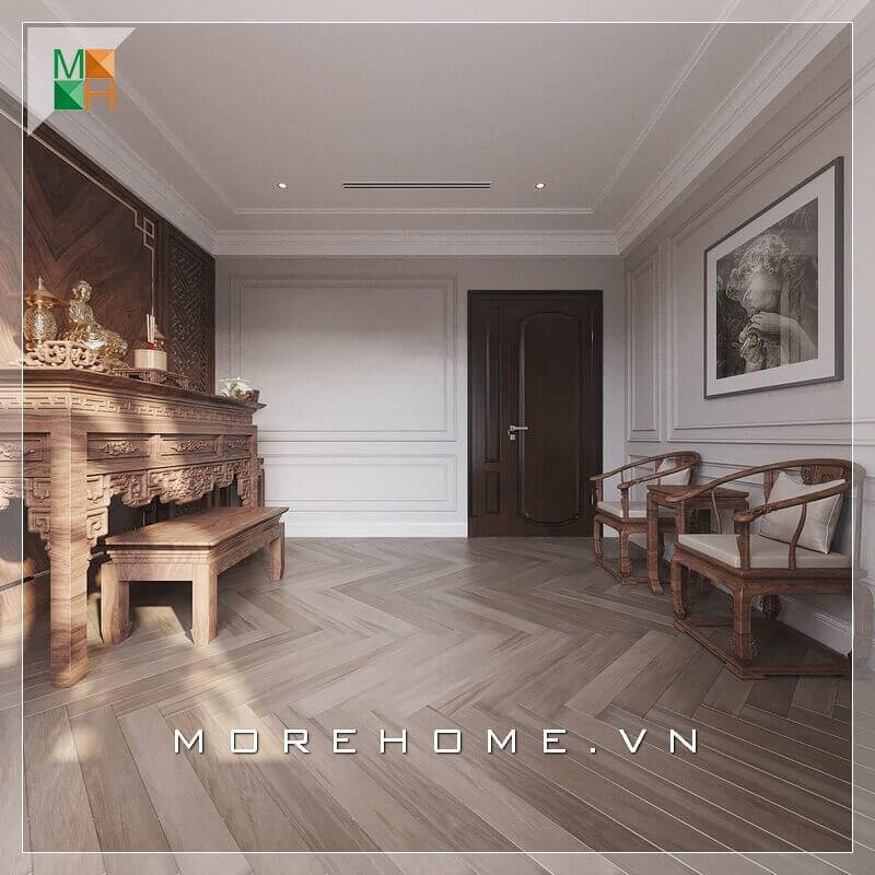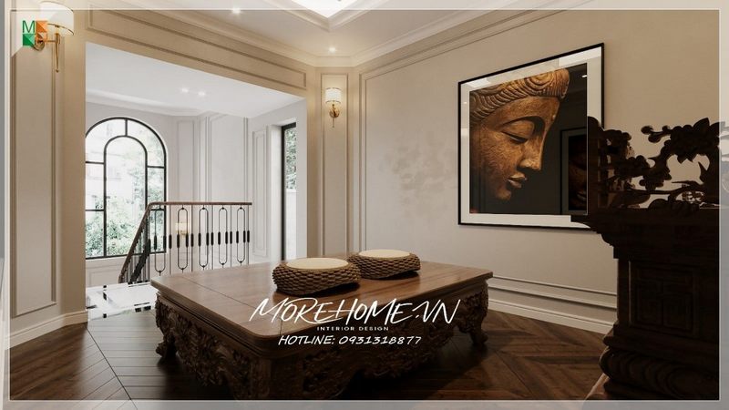 Bức tranh canvas treo tường phòng thờ của chủ để Phật góp phần làm cho không gian thờ cúng trở nên thanh tịnh và trang nghiêm hơn.