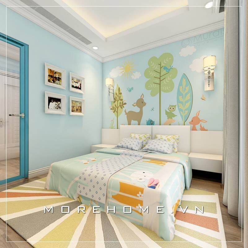 Phòng ngủ trẻ em được trang trí tinh tế bằng nội thất gỗ công nghiệp màu trắng, vách tường được làm đẹp bằng giấy dán tường màu xanh nhẹ tạo nên một điểm nhấn khó quên.