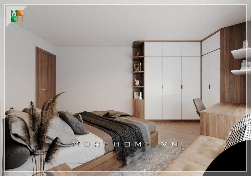 Nội thất phòng ngủ chung cư hiện đại đơn giản nhưng không kém phần sang trọng với kiểu dáng đơn giản hiện đại. Chỉ với 2 gam màu chủ đạo trắng - nâu kết hợp gợi lên một không gian nghỉ ngơi đầy thoải mái và thư giãn