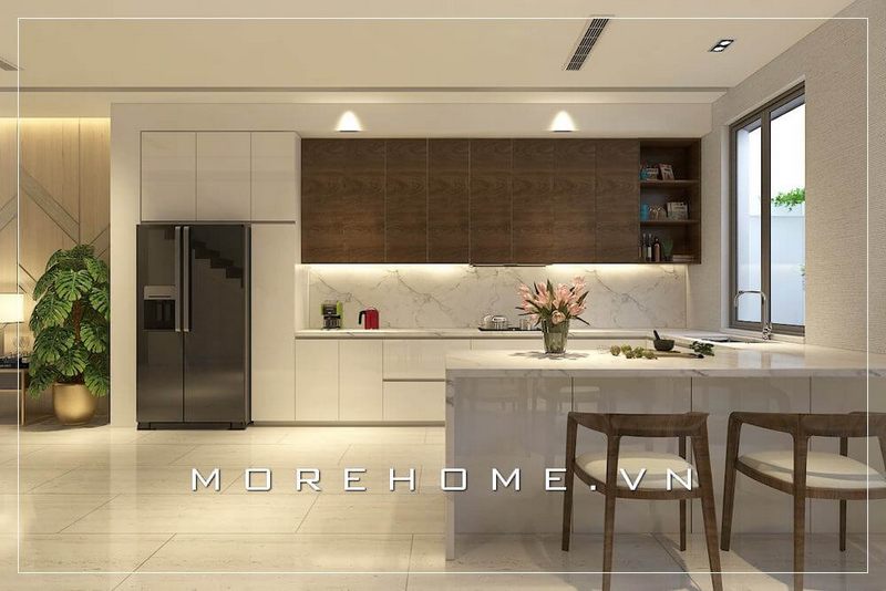 Những gam màu nhẹ nhàng như trắng, kem hay xám có thể tạo cảm giác rộng rãi và thanh lịch, trong khi các vật liệu như đá marble hoặc gỗ tự nhiên mang lại sự sang trọng và ấm cúng. Đặc biệt, hãy chú ý đến việc sử dụng ánh sáng, với đèn chùm tinh tế hoặc đèn LED âm trần để làm nổi bật không gian, tạo cảm hứng cho những buổi nấu nướng thú vị.