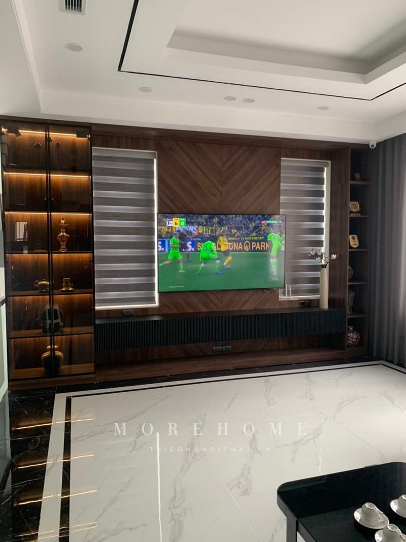 Sản phẩm công trình thi công thực tế kệ tivi hiện đại cho phòng khách biệt thự Vinhomes Riverside Long Biên Hà Nội